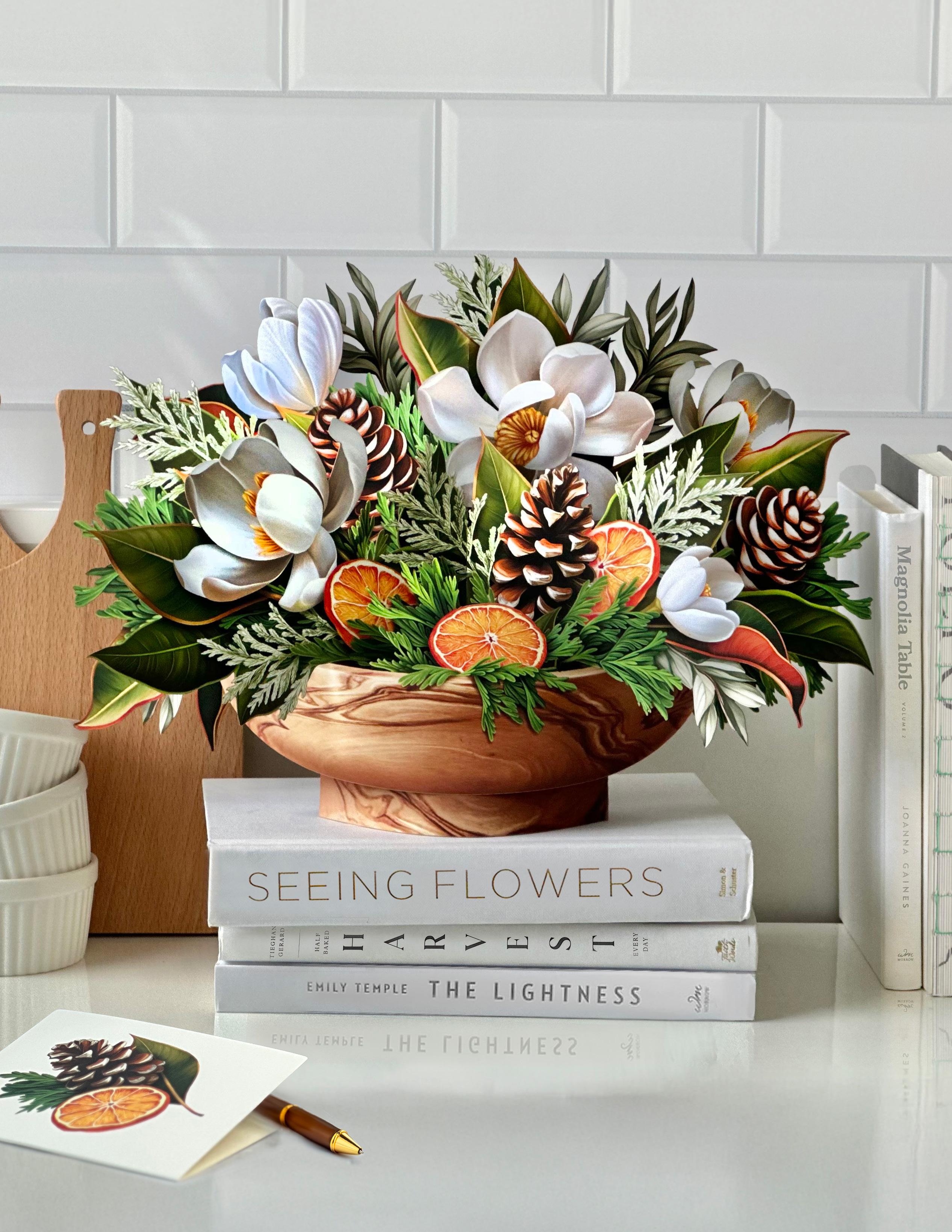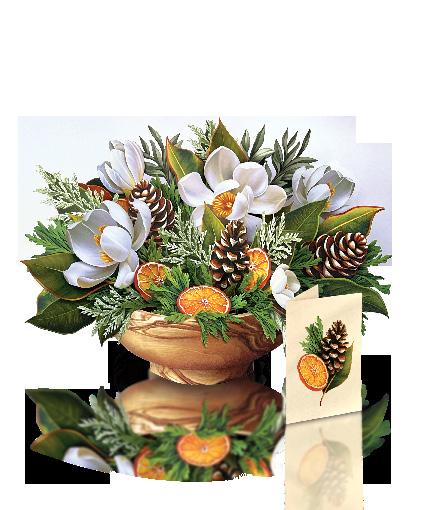 Gorgeous magnolias sit peacefully alongside dried orange slices, pine cones, and an assortment of yuletide greeneries in an earthy, textured wooden bowl.