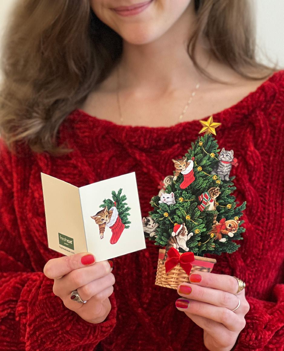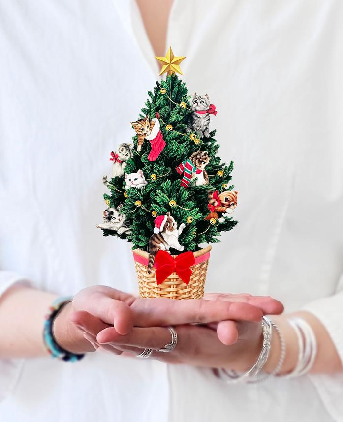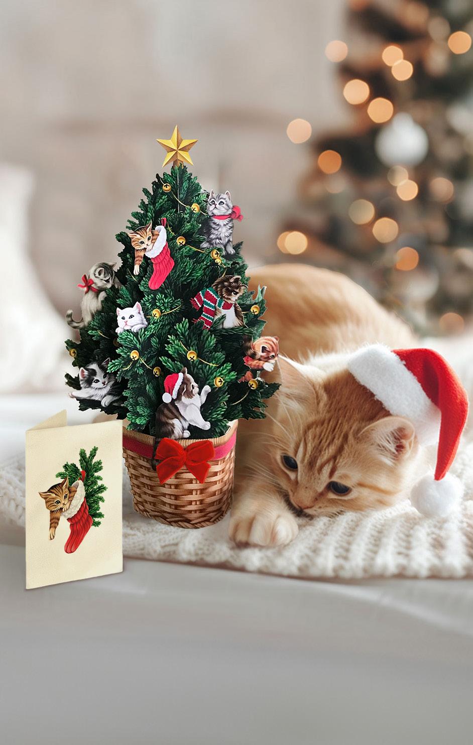 Celebrate the season with our festive felines! Watch as Santa’s tiniest helpers play hide and seek between the pines and garland. This adorable miniature tree nests in a woven basket with a red velvet bow.