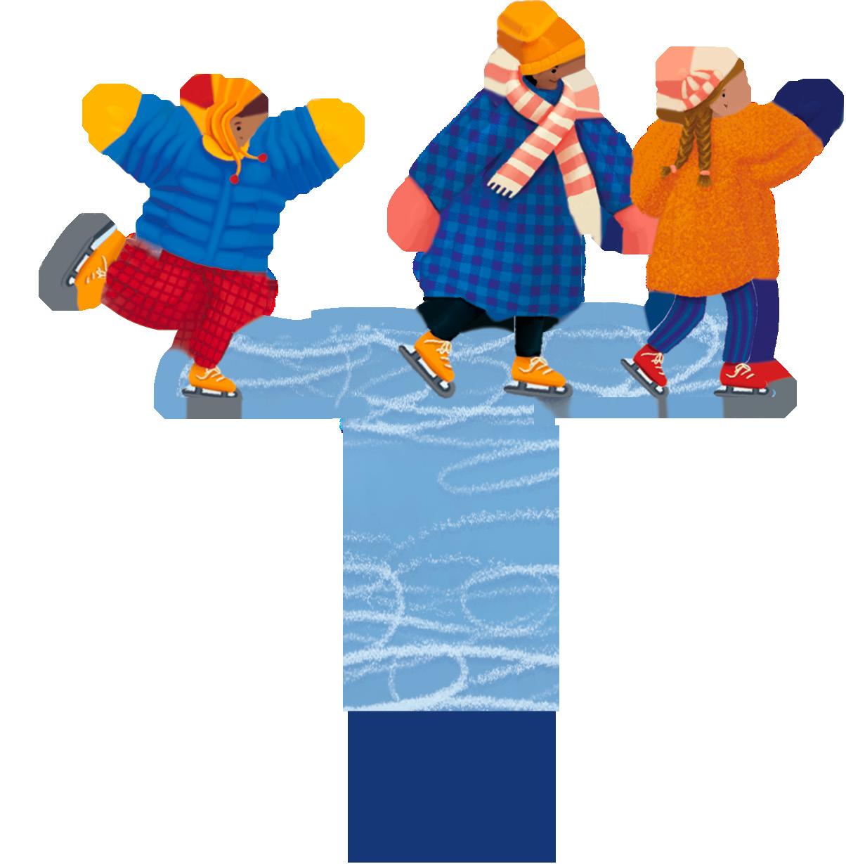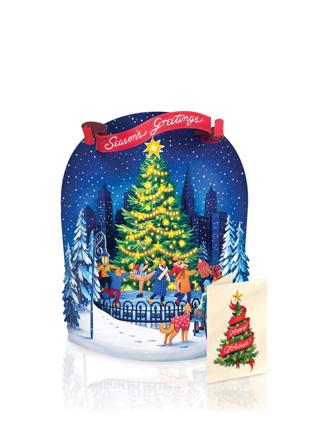 Festive skaters dance under a frosty city skyline, and a twinkling Christmas tree brings the magic of winter to life.