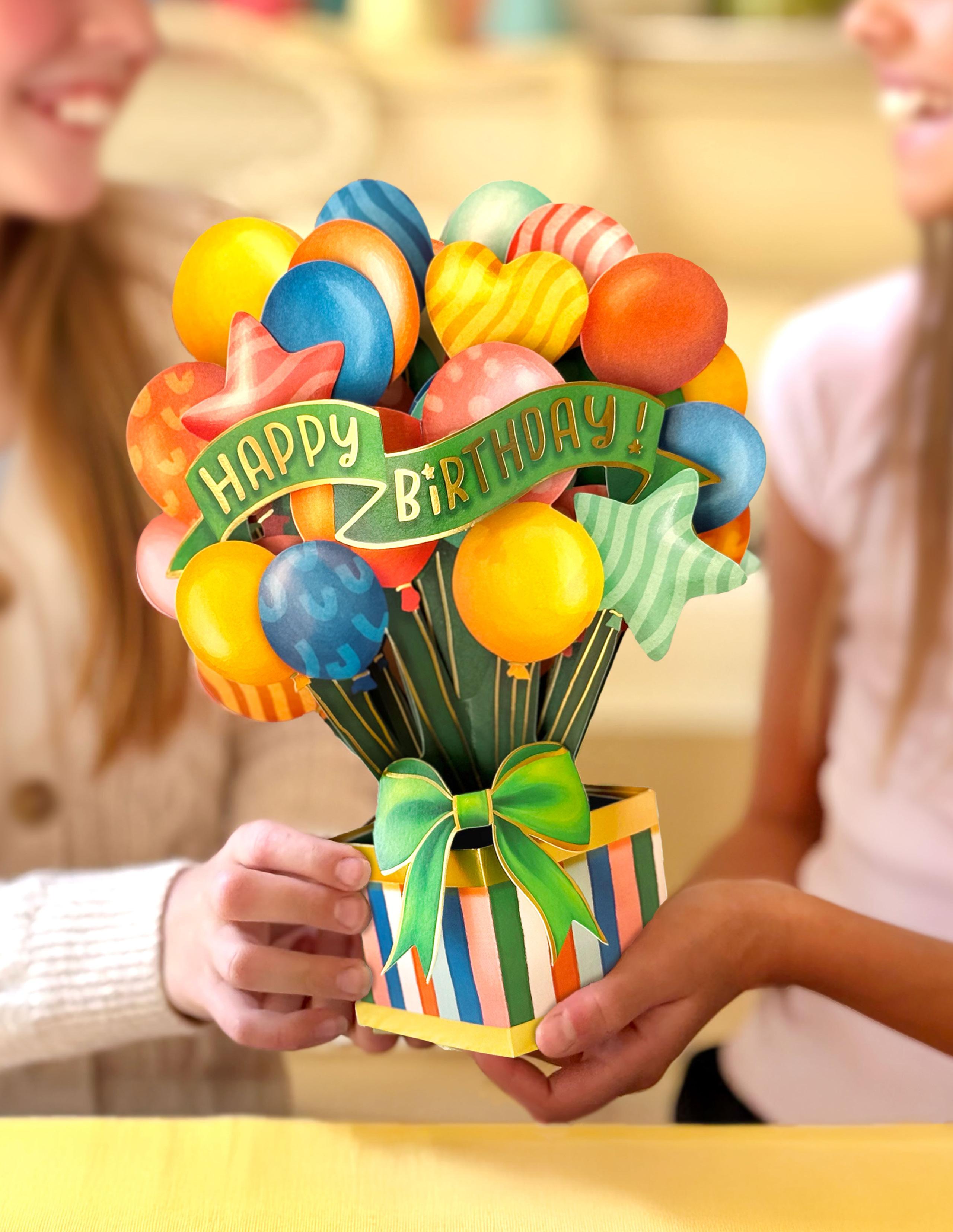 Celebrate their special day with our Birthday Balloons pop-up card! Shimmering with gold-foil details, this festive design opens to reveal a cascade of colorful balloons.