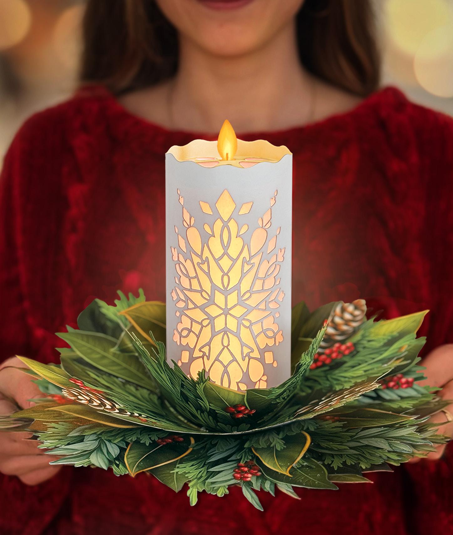 Featuring intricate laser-cut details, this beautiful candle softly lights up from within. Surrounded by a festive wreath, this centerpiece can be placed on a mantel, tabletop, or gifted to someone special.