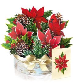 This frosty medley of pinecones, holly, and vibrant poinsettia leaves is displayed in a white birch log. Complete with a satin bow and cheerful cardinal.