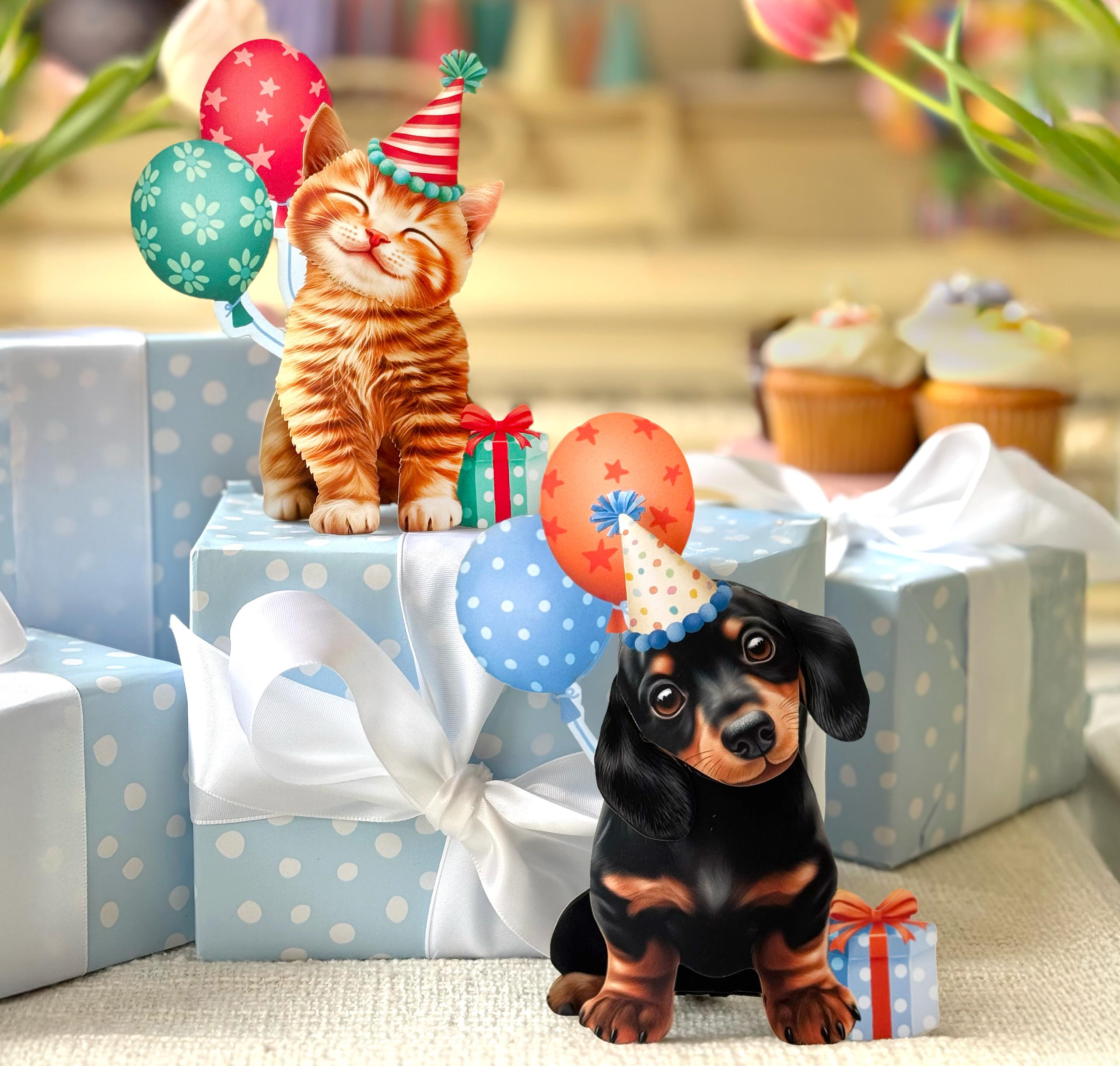 Mini Birthday Kitten & Puppy pocket-sized pets, in birthday outfits!