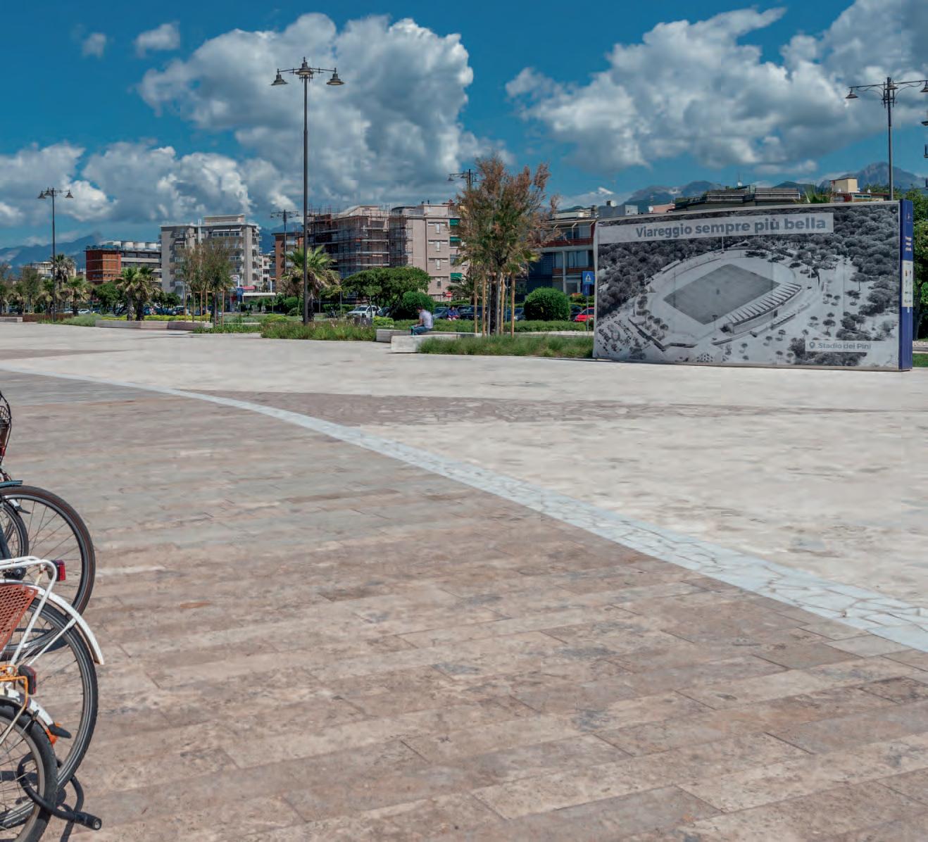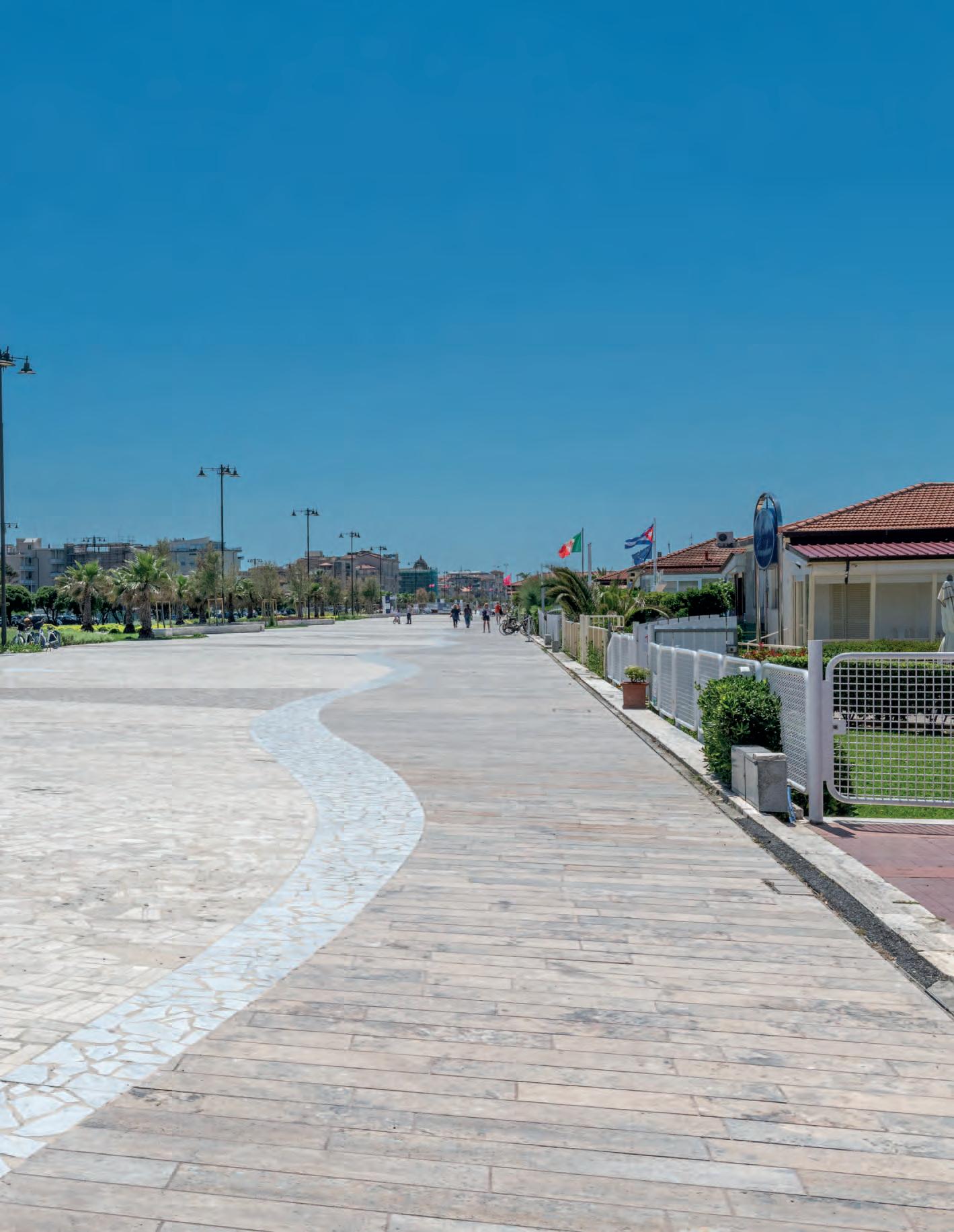 Si entra a Viareggio in molti modi: la città accoglie turisti e cittadini a seconda dei tempi e degli scopi. In treno: stormi di ragazzi che sciamano dalla stazione, pallone in mano e zaini in spalla, verso la Passeggiata lungo una via Mazzini inondata dal sole. Dalla zona industriale, velocemente scendendo dall’Aurelia: uscita Cotone e poi subito la Darsena e i suoi cantieri. In centro: gli uffici, i negozi e le vie ortogonali col mare che si intuisce in fondo ad ogni incrocio; mai visto, solo percepito. Dal porto, respiro che spazia aperto, le apuane a perpendicolo, il molo che accoglie, un paio di scossoni in entrata e dopo le acque rinchiuse, ritagliate dagli approdi. E poi c’è la Terrazza della Repubblica, tempo sospeso di vacanze e profumo di liquirizia che al mattino odora dalle piante di camuciolo lungo le aiuole che ancora portano i segni di un recentissimo rifacimento. I sassi sono bianchi, l’irrigazione perfetta, la pavimentazione è in travertino coi disegni dai colori tenui: simulazione di onde, spiaggia e vele in un percorso rettilineo e rialzato che accompagna chi, dalla Fossa dell’Abate, voglia fare una passeggiata fino al Principino, e viceversa. Al centro piazza Zara, che arriva quando non te l’aspetti: le panchine, la fontana, l’affaccio sul mare. Il riposo di un secondo prima di continuare il cammino. In totale 22mila metri quadrati di superficie, per due chilometri e 200 metri lineari. In euro, oltre sei milioni di investimento, per una delle opere pubbliche più importanti dell’Amministrazione Del Ghingaro, realizzata anche grazie al contributo della Fondazione Cassa di Risparmio di Lucca.