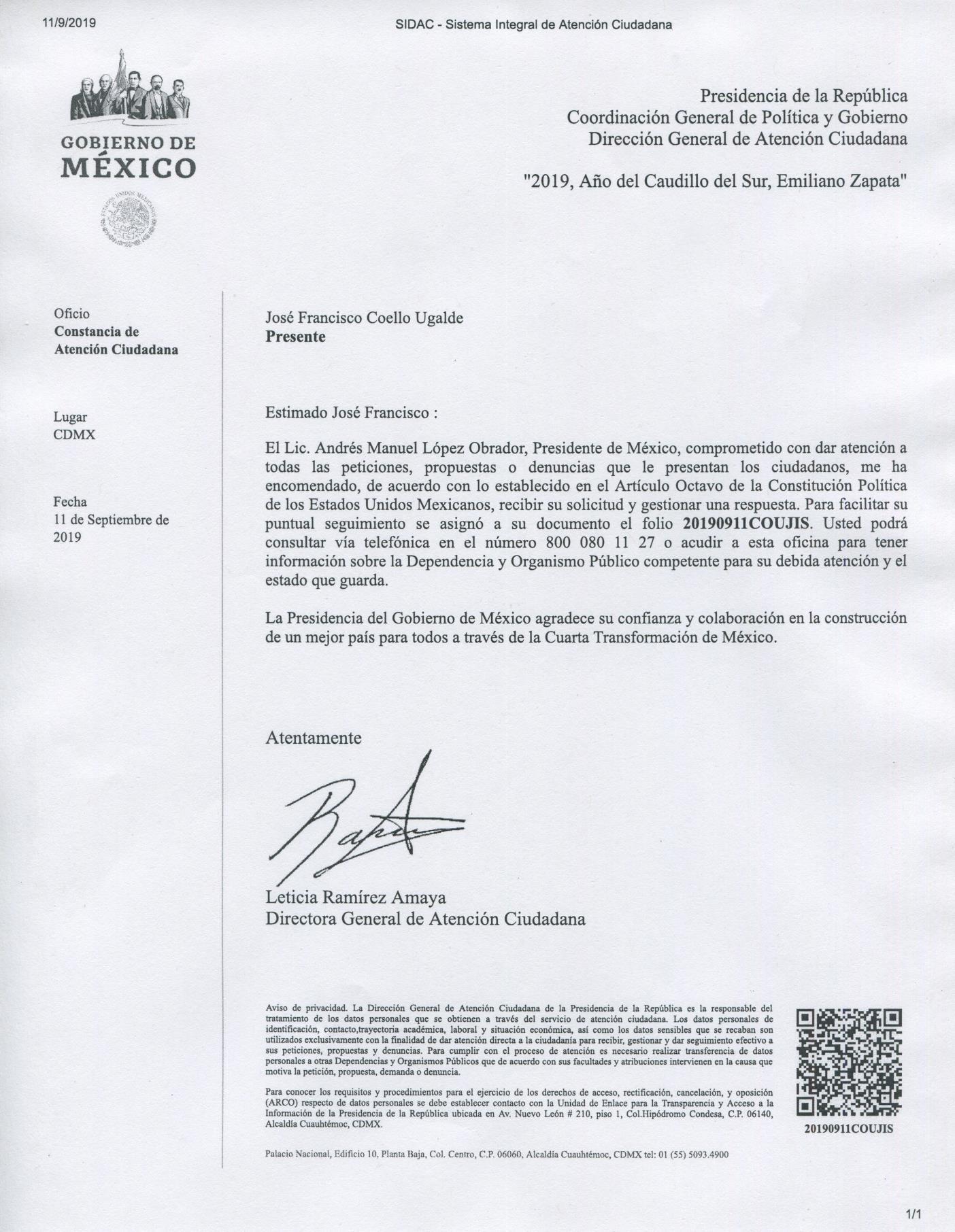 El siguiente, es un mensaje enviado a la Presidencia de la República y recibido en septiembre de 2019 por Oficialía de partes: