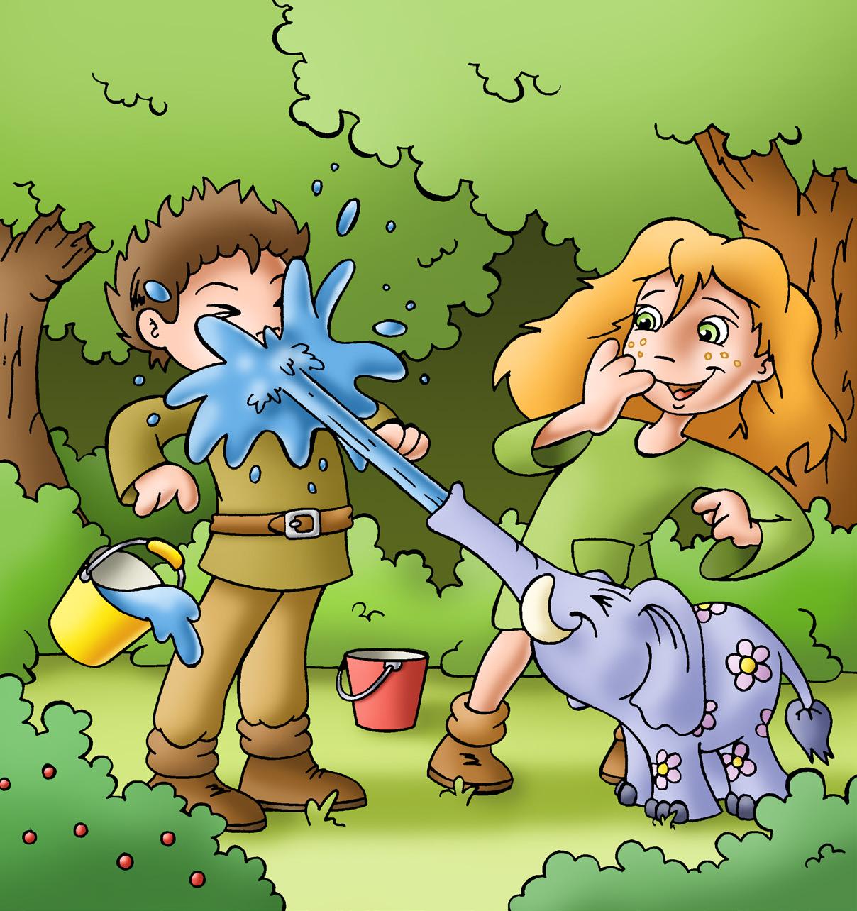 Det havde elefanten nu ikke tænkt sig. Den su gede alt det vand, den kunne, op i sin snabel og sprøjtede det lige i hovedet på Sigurd. Så måtte Sille overgive sig. Det så så sjovt ud, at hun måtte holde sig på maven af grin, og det endte med, at sprøjteriet udviklede sig til en vandkamp, hvor det var Sille og Sigurd imod elefanten.