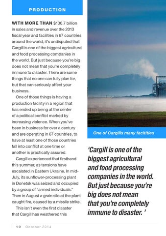 P ROD U C T ION With more than $136.7 billion in sales and revenue over the 2013 fiscal year and facilities in 67 countries around the world, it’s undisputed that Cargill is one of the biggest agricultural and food processing companies in the world. But just because you’re big does not mean that you’re completely immune to disaster. There are some things that no one can fully plan for, but that can seriously affect your business. One of those things is having a production facility in a region that has ended up being at the center of a political conflict marked by increasing violence. When you’ve been in business for over a century and are operating in 67 countries, to have at least one of those countries fall into conflict at one time or another is practically assured. Cargill experienced that firsthand this summer, as tensions have escalated in Eastern Ukraine. In midJuly, its sunflower-processing plant in Donetsk was seized and occupied by a group of “armed individuals.” Then in August a grain silo at the plant caught fire, caused by a missile strike. This isn’t even the first disaster that Cargill has weathered this 10