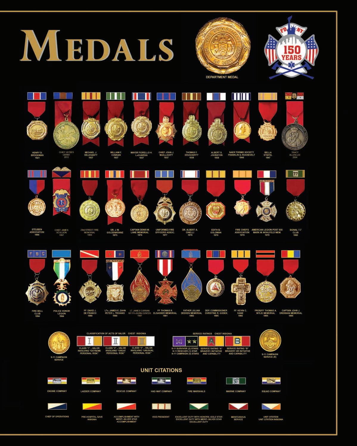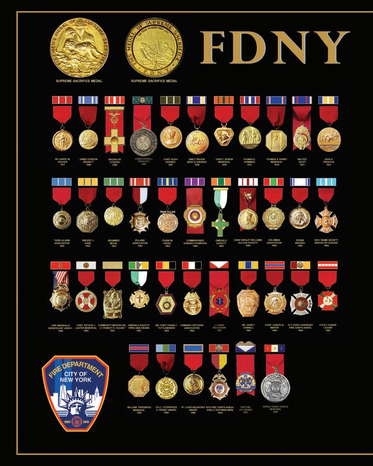 This medal, endowed by the members of the Pipes and Drums of the FDNY Emerald Society Bagpipe Band, is awarded to a member of the Department who performs an outstanding act of heroism in keeping with the FDNY’s highest traditions First awarded in 1981 (Page 49)