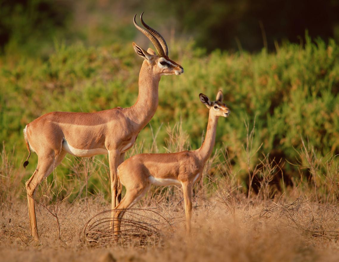 Males reach 35 or 42 inches at the shoulder and weigh up to 115 lbs, with backward curving lyre shaped horns. Their reddish brown coats and slender builds make them instantly recognizable. Gerenuks often stand on their hind legs to reach leaves an adaptation that sets them apart from all other antelope.