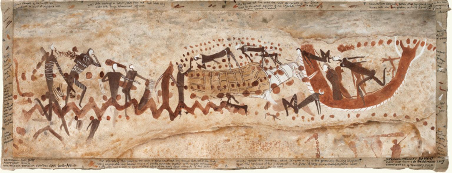 One particular endeavor that caught our attention was Stephen’s assignment to document the “Jewel of Drakensberg.” This aweinspiring panel, measuring a staggering 70 inches in width, is situated on the roof of a site and took Stephen an impressive four months to complete. Today, the magnificent “Christmas Shelter” painting finds its home at the Rock Art Research Institute at Wits University in Johannesburg, South Africa.