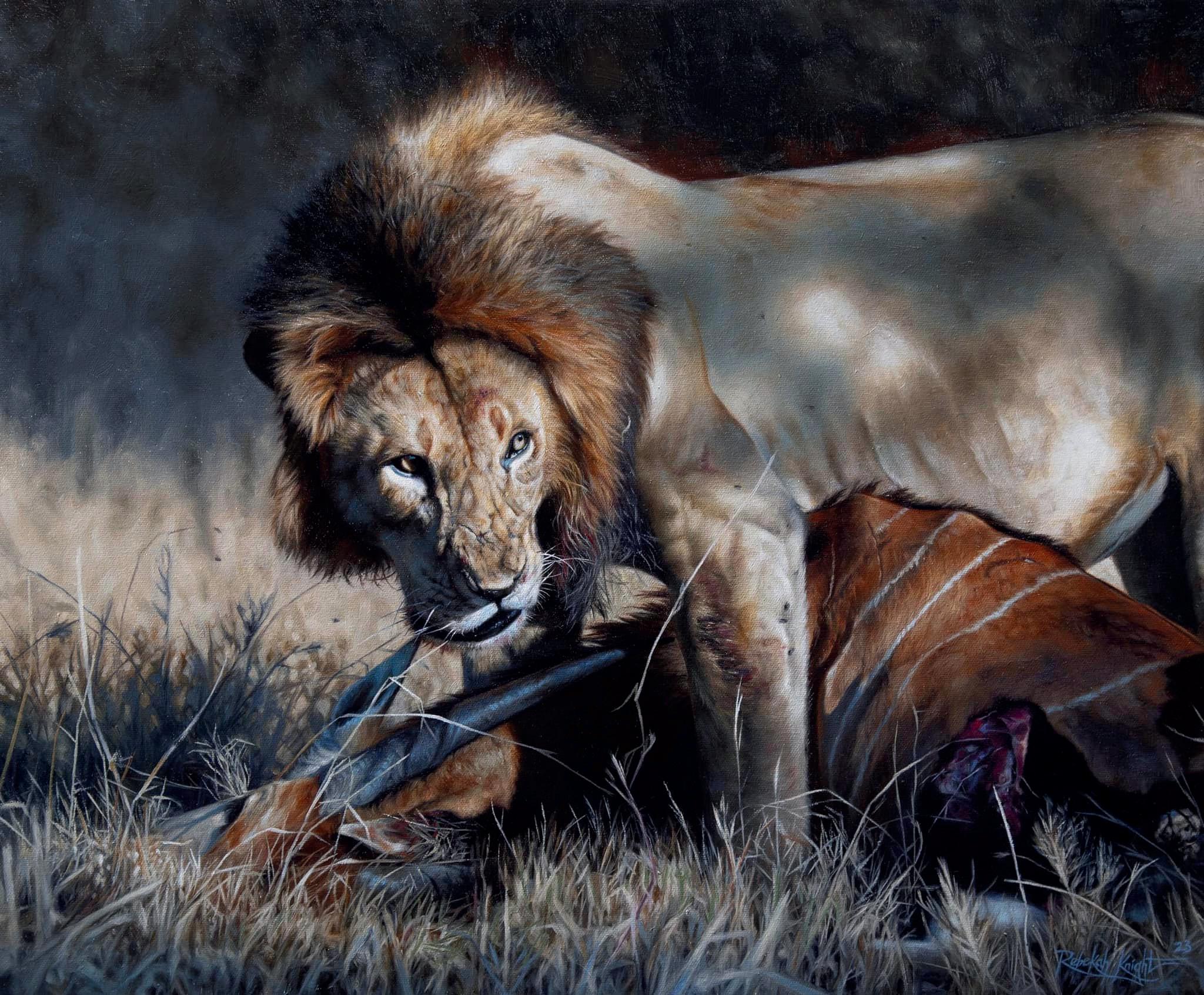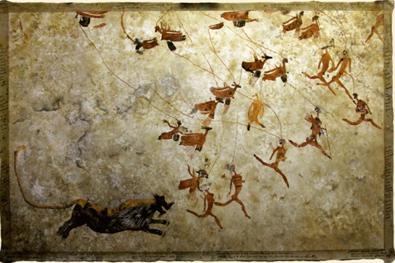 Stephen’s expertise in re-creating and documenting rock art has also influenced his wildlife artwork. He incorporates his knowledge of ancient paint-making techniques to infuse depth and texture into his canvases. To make his art even more engaging and meaningful, he adds animal spoor (tracks and signs) and includes descriptive text in the margins. These notes provide a glimpse into his artistic process and offer a deeper understanding of the animals he portrays. “When painting, I make notes in the margins of the canvas.