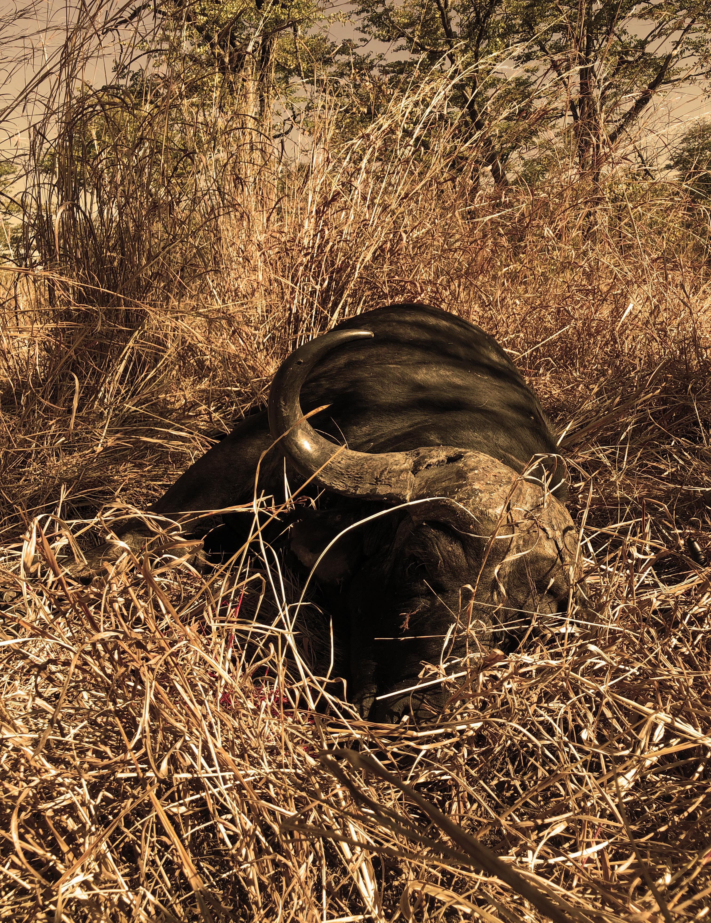 The Professional Hunter ran his hand along one of the bull’s curved black horns—it was a fine head. Removing his wide-brimmed Stetson, he placed it on the ground beside him and leaned his gun against the buffalo’s massive body. He wiped his forehead with the back of his hand.