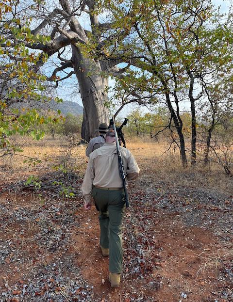 and of course, the opportunity to see the continent’s iconic animals. And finally, I wanted to hear lions again—to sit by a fire nursing a drink, enjoying the smell of an impala loin roasting, and listening to that guttural “UNNNH-unh, UNNNH-unh” of the boss lion calling his crew together for the evening’s hunt. Our tickets were bought, our itinerary planned, and we were on our way in mid-April of 2024. I approached the Delta counter in Myrtle Beach with some trepidation, having read disturbing reports of the difficulties of flying with firearms. But the nice young lady simply asked if the rifle was unloaded, gave me a red tag to stick inside the locked case, and assured me that the Winchester Model 70 in .375 would meet me in Africa when I got there. Gotta love the South.