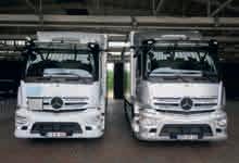 We reden het konvooi van drie Mercedes-Benz eActros tegemoet, dat in 5 weken tijd ongeveer 3.700 km in elektrische modus reed.