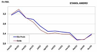 Período São Paulo Goiás ANIDRO 19/02/2024 - 23/02/2024 2,370 2,349 26/02/2024 - 01/03/2024 2,400 2,361 04/03/2024 - 08/03/2024 2,360 2,360 11/03/2024 - 15/03/2024 2,364 N/D 18/03/2024 - 22/03/2024 2,408 2,233 fevereiro de 2023 3,037 3,082 fevereiro de 2024 2,389 2,355 Variação 19/02/202422/03/2024 1,6% -4,9% Variação fevereiro de 2024 x fevereiro de 2023 -21,3% -23,6% Período São Paulo Goiás HIDRATADO 19/02/2024 - 23/02/2024 2,144 2,054 26/02/2024 - 01/03/2024 2,122 2,059 04/03/2024 - 08/03/2024 2,071 2,049 11/03/2024 - 15/03/2024 2,064 2,048 18/03/2024 - 22/03/2024 2,168 2,120 fevereiro de 2023 2,704 2,672 fevereiro de 2024 2,152 2,062 Variação 19/02/202422/03/2024 1,1% 3,2% Variação fevereiro de 2024 x fevereiro de 2023 -20,4% -22,8% em R$/L