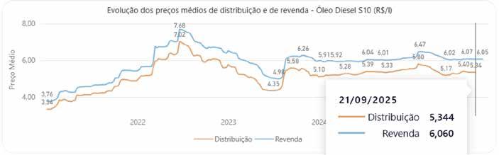 1 - A partir de 17/08/2020 os dados de distribuição de etanol hidratado NÃO contemplam a parcela de ICMS/Substituição 2 - Desde a semana iniciada em 23/08/2020 os preços de distribuição são informados pelas distribuidoras à ANP através do SIMP (*) Fonte: ANP – Painel Dinâmico de Preços de Combustíveis e Derivados do Petróleo, em 04/11/2025