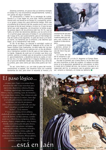 constancia de que ese collado ha sentido nuestros pasos por allí, pero esa cumbre se queda en la lista de espera. La bajada es larga y penosa, porque el viento ha formado placas de nieve muy peligrosas. La noche del día 20 la volvemos a pasar en el Campo IV y el día 21 llegamos al Campo Base. Ha sido mi primera vez a tanta altura y he de decir que se nota muchísimo la falta de oxígeno, la cabeza te duele como si te la estuvieran apretando en una prensa, la nariz te duele de la frialdad del aire, las manos y los pies no te responden del frío, el cansancio casi te paraliza, pero aún así, volvería a intentarlo, el Lhotse es bellísimo.