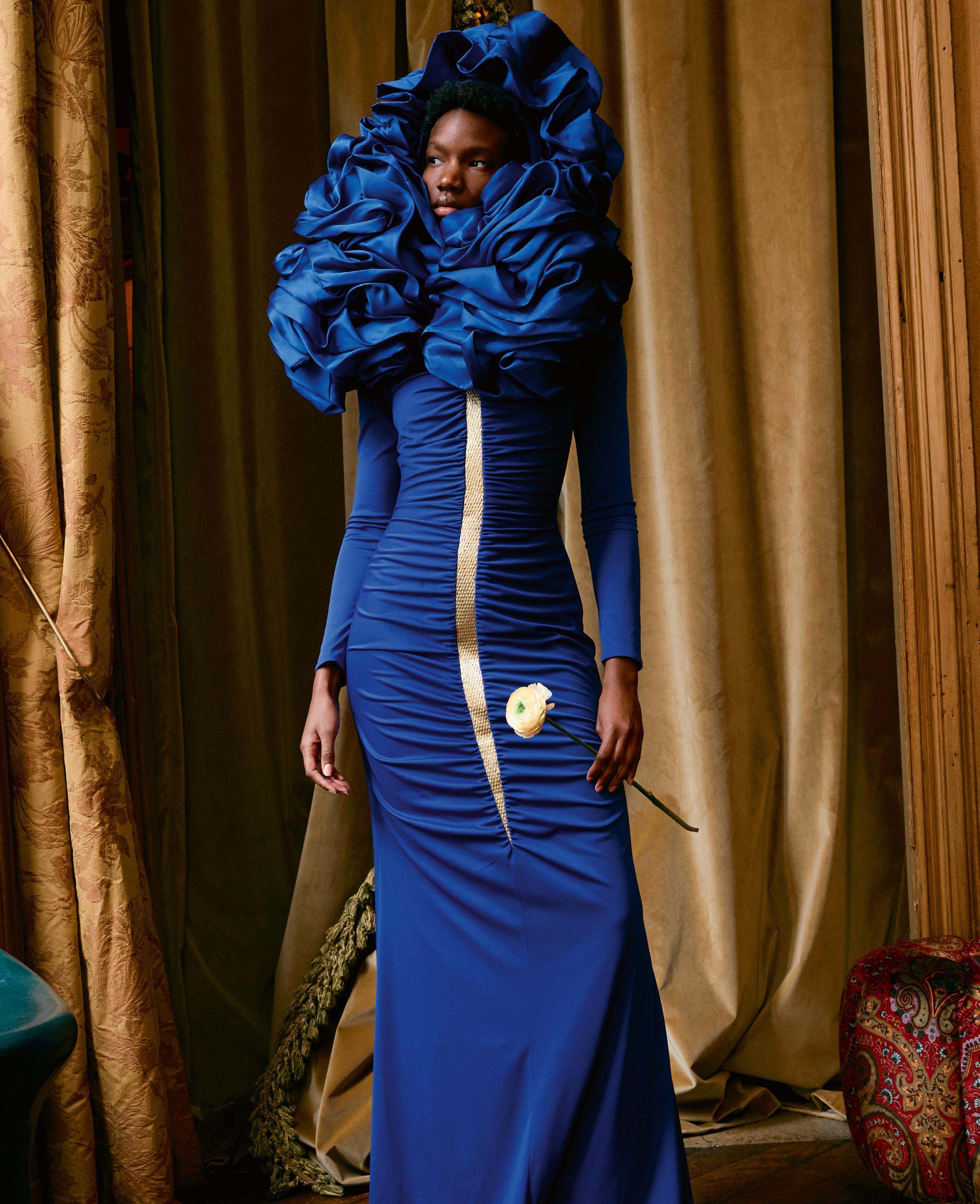 A flowing blue dress adorned with embroidered roses highlights another side of Saint Laurent’s work—refinement and timelessness, always open to new interpretations.