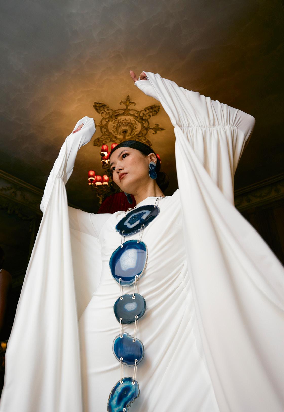 Mattiozzi is not just clothing. It is sculpture made of fabric, paintings drawn with threads. Every piece is unique because it is created by hand. Zhanna employs the draping method, much like ancient masters, ensuring that each garment retains the essence of her inspiration. One of her iconic works is the dress from the Innamorata collection (translated from Italian as “In Love”). Created in a moment of deep emotion, it embodies tenderness and love in a celestial blue hue and refined lines. “My pieces are emotions that I sew into every stitch. They are a way to tell a story through clothing,” the designer shares.