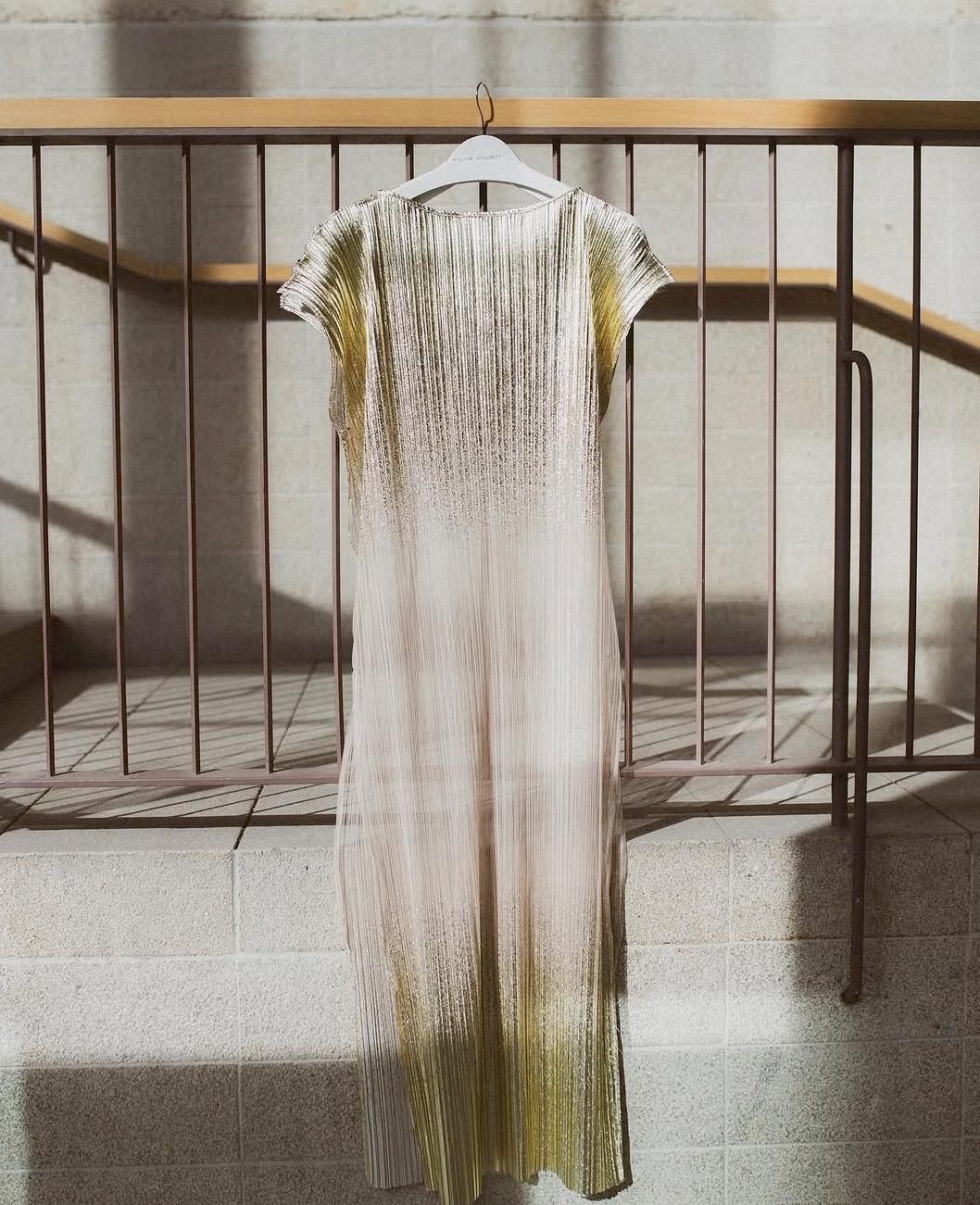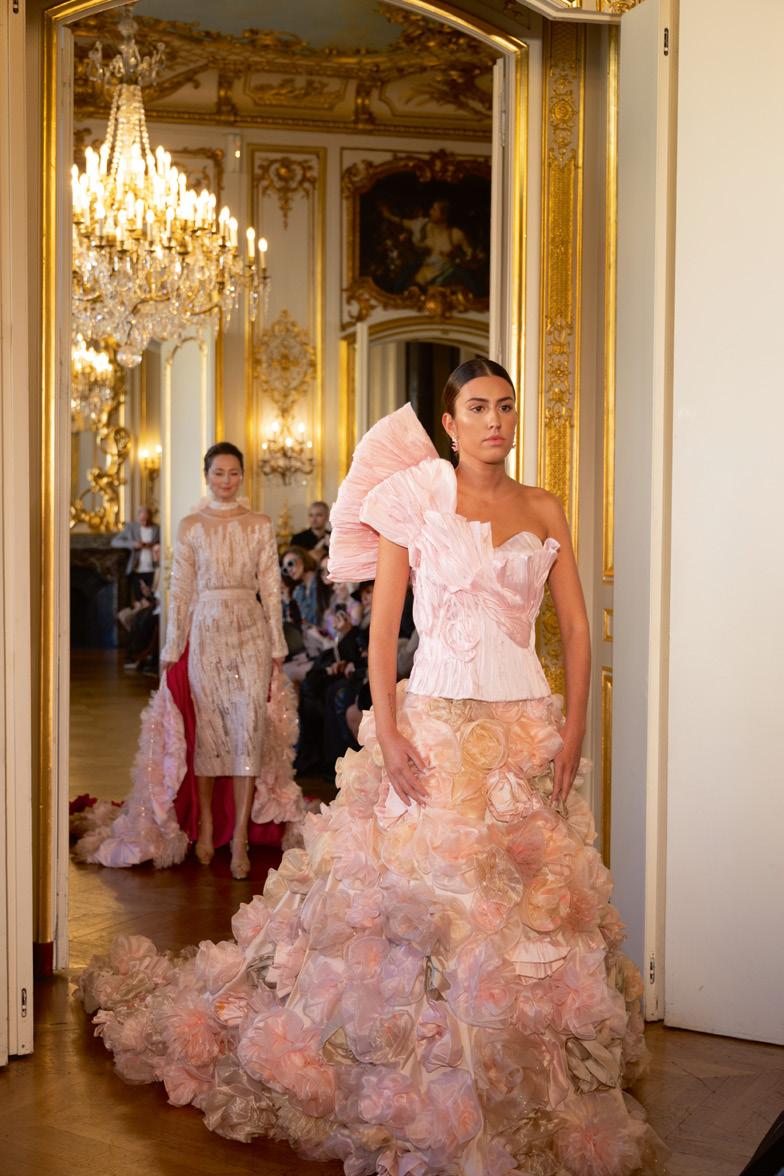 And, of course, there is the gown with abstract flowers on a pale pink background. It is an ode to lightness and serenity, reminding us of how nature inspires us to embrace life with ease and freedom.