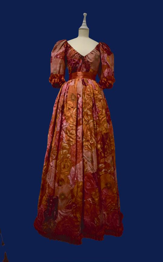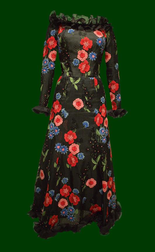 Bright yellow gowns with pink and green floral patterns transport us to carefree summer gardens, brimming with life and light. A blue dress adorned with delicately embroidered roses seems inspired by Renaissance paintings, where every petal tells a story.