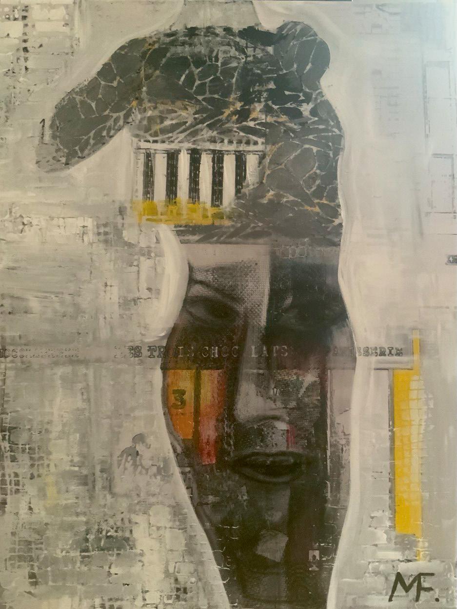 Faces emerge and disappear—fragmented, elusive, like fleeting glances in café windows. They are not portraits; they are echoes. Shadows of elegance. Traces of conversations left unfinished. I distort them intentionally, layering marble cracks over expressions, blending newspaper clippings with eyes that seem to watch but never reveal. It is my way of capturing the ephemeral nature of beauty—fashion fades, cities transform, art remains. Red lips and bold lines stand defiantly against raw textures, just as haute couture stands against the industrialization of time.