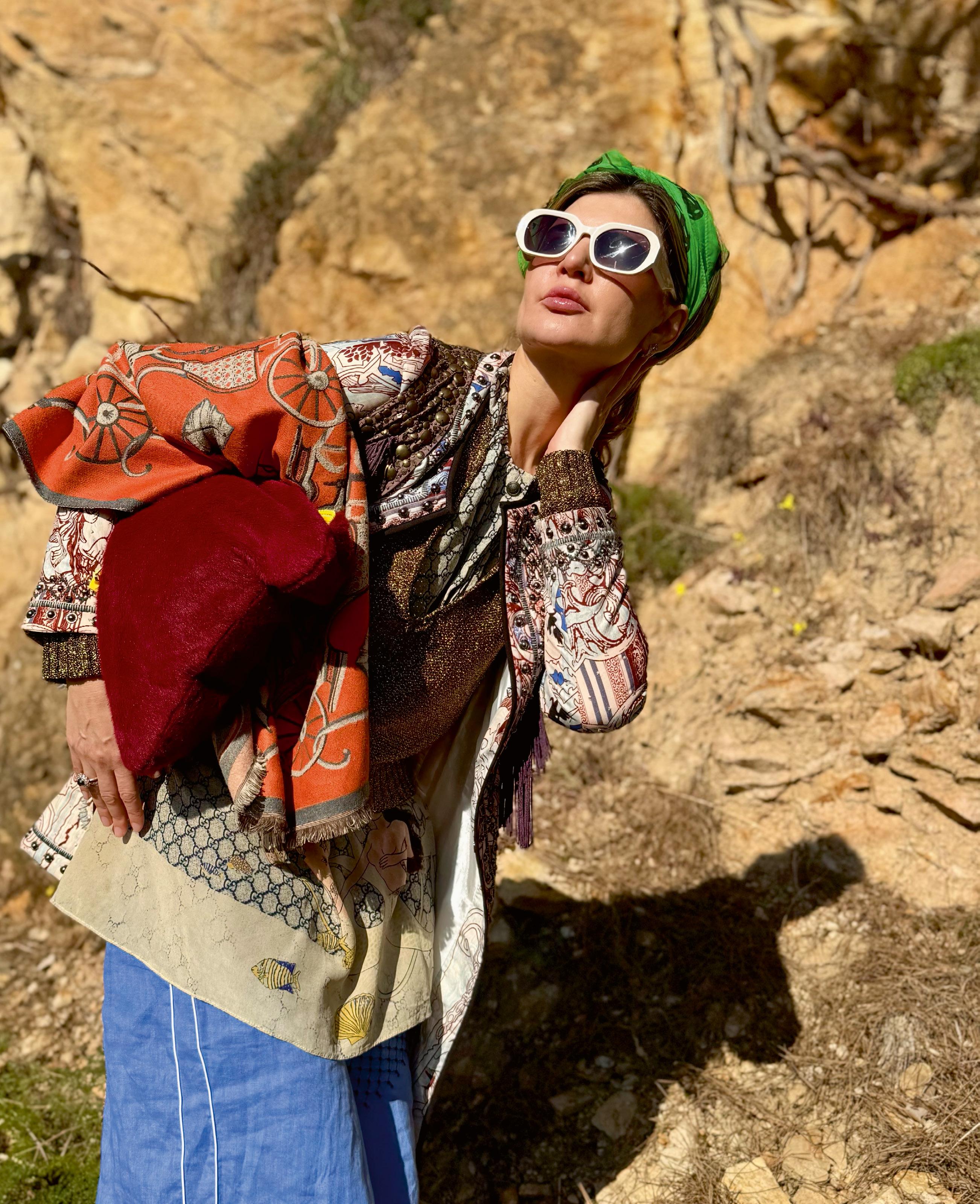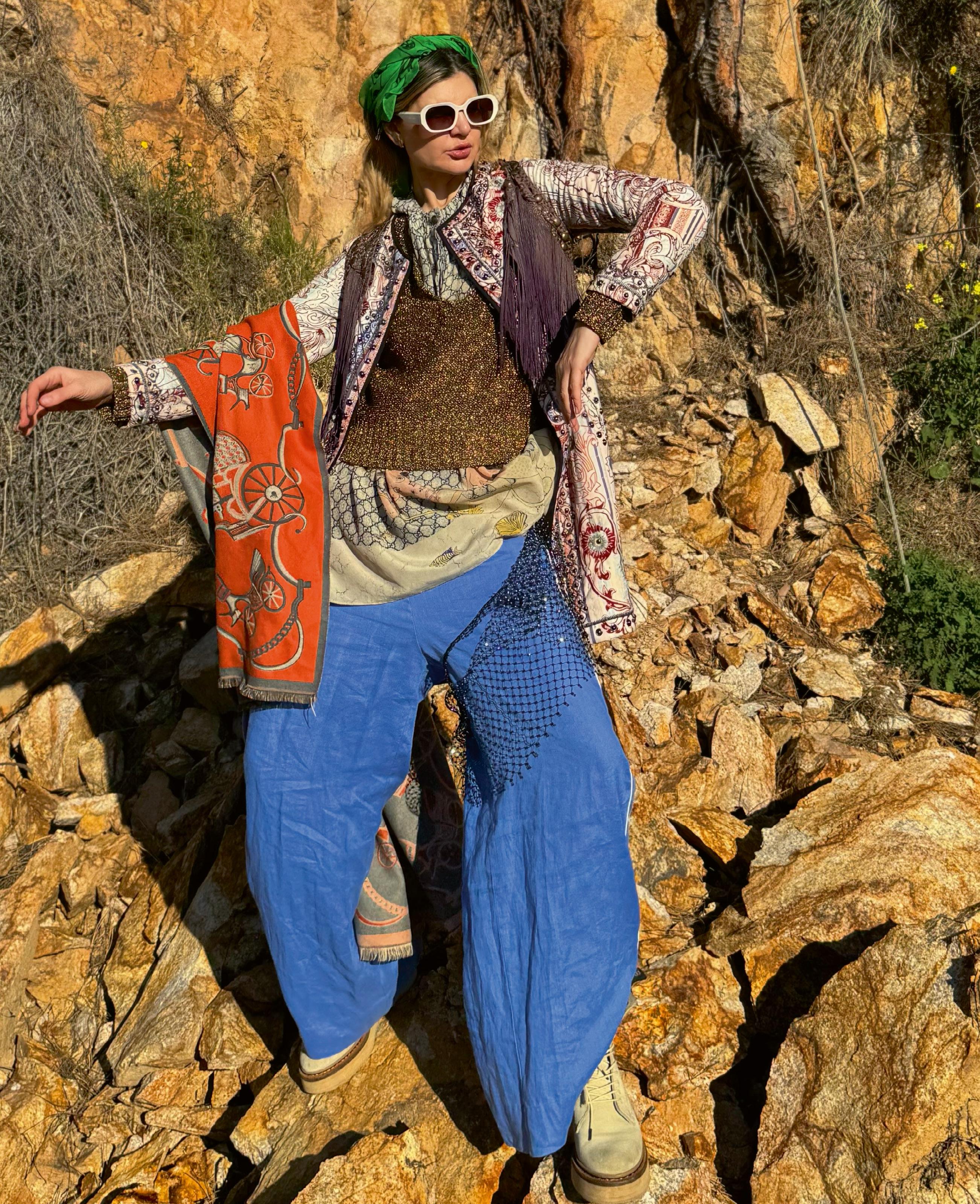 hands glide over the silk of my trousers, I think of Marrakech—its wavering, mirage-like lines dissolving into the air. I do not simply dress. I quote. I engage in a dialogue with those who came before me and those who will come after.