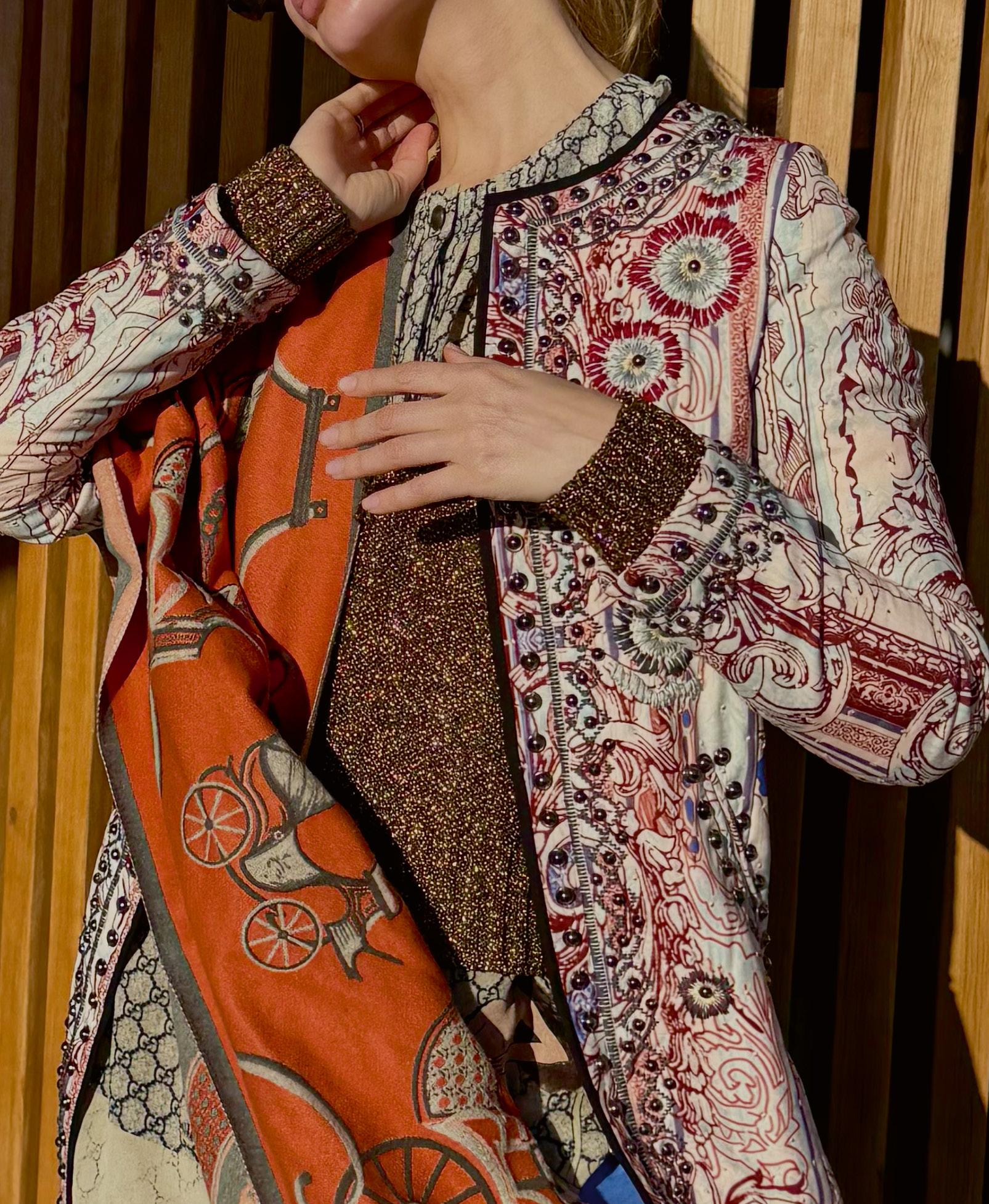 Every time we drape a silk scarf around our shoulders, fasten our hair with an ornate pin, or wear a pajama suit beyond the bedroom, we become part of this great narrative—one in which East and West are no longer opposites but two magnetic poles of the same artistic force.