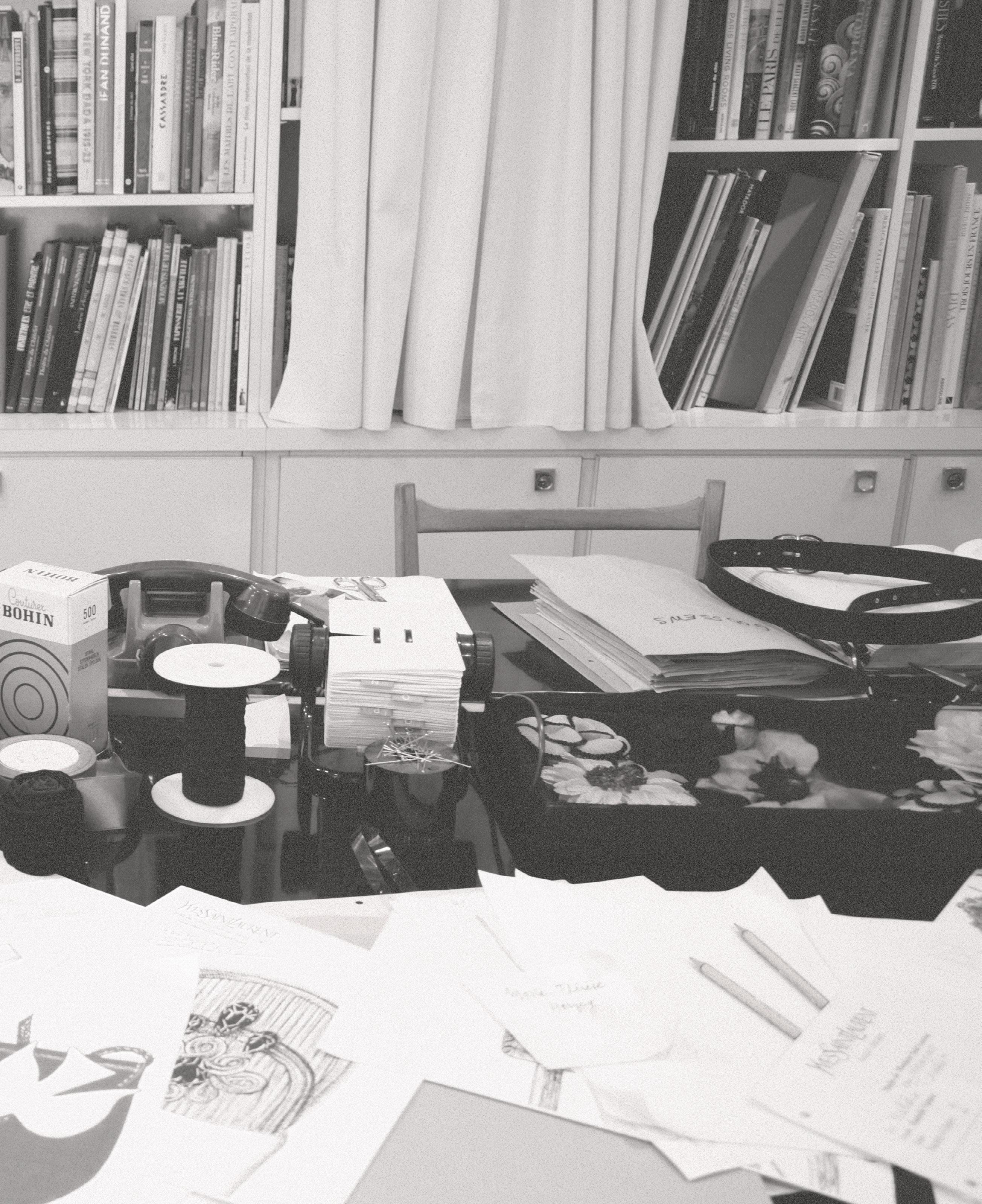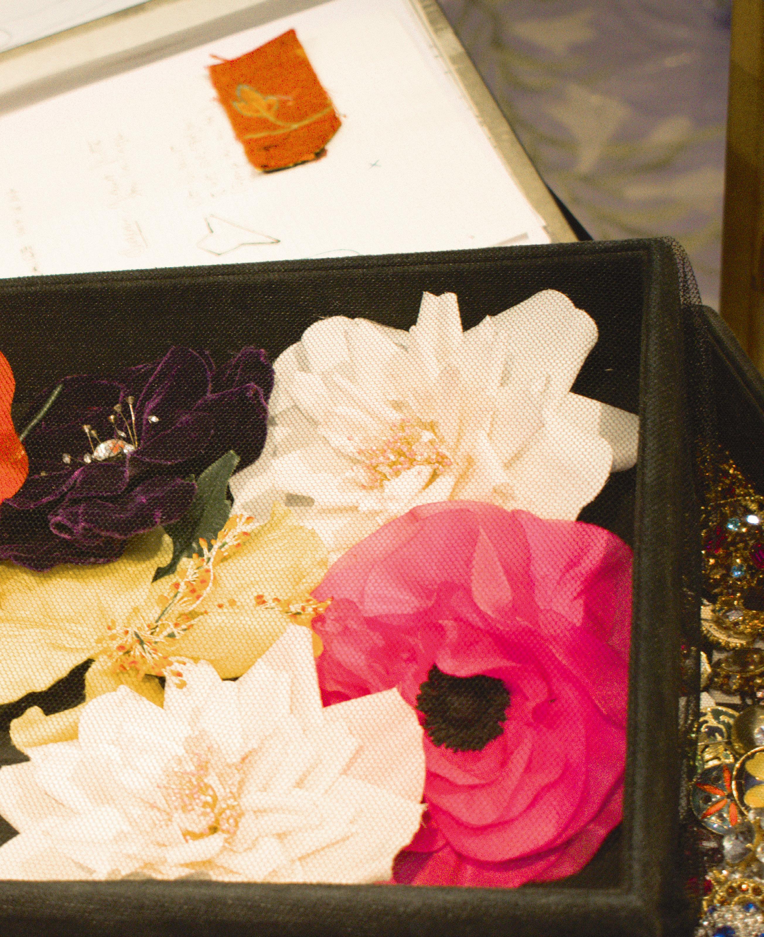 Saint Laurent’s creative process reveals his search for inspiration in nature. A box of artificial flowers, which the designer used as studies for his dresses, shows how nature became his muse. His workspace, filled with sketches, embellishments, and fabrics, unveils the magic of creating his timeless designs.