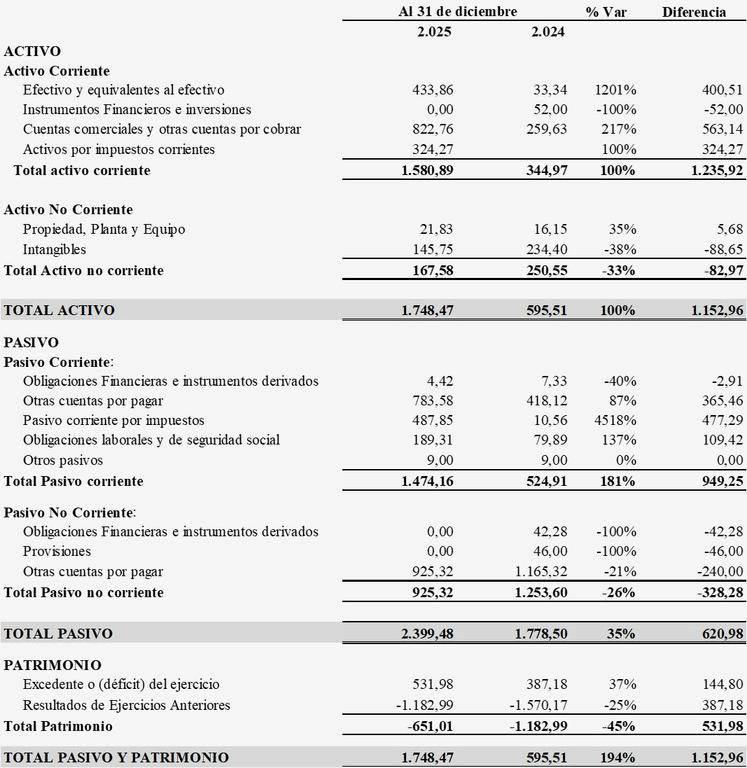 Al 31 de diciembre de 2025, los activos aumentaron de 595,51 a 1.748,47, principalmente por el incremento en efectivo y cuentas por cobrar, lo que mejora la liquidez de la entidad.