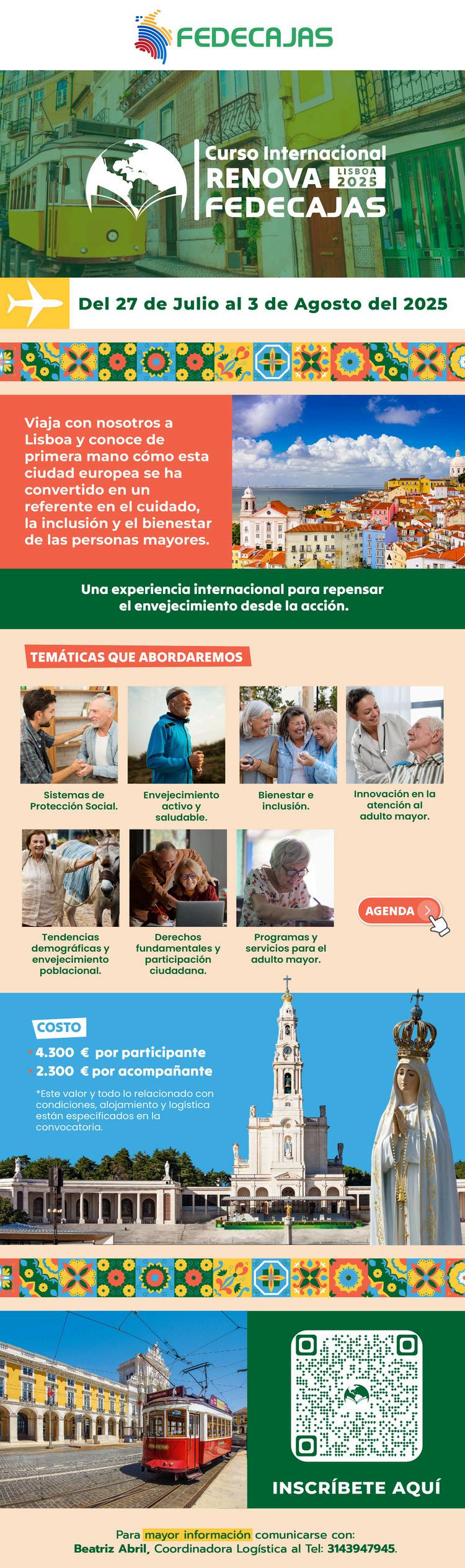 Del 27 de julio al 3 de agosto de 2025, se desarrolló en Lisboa, Portugal, el Curso Internacional Renova, cuyo objetivo fue promover la transferencia de conocimientos y experiencias en la atención al adulto mayor, abordando el envejecimiento como un desafío global, con énfasis en el Sistema de Subsidio Familiar y el roldelasCajasdeCompensaciónFamiliar.