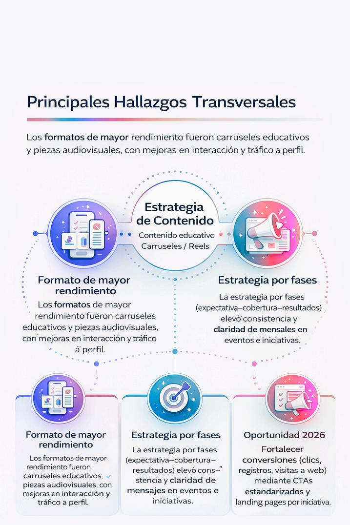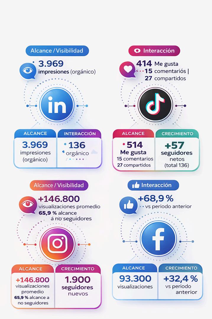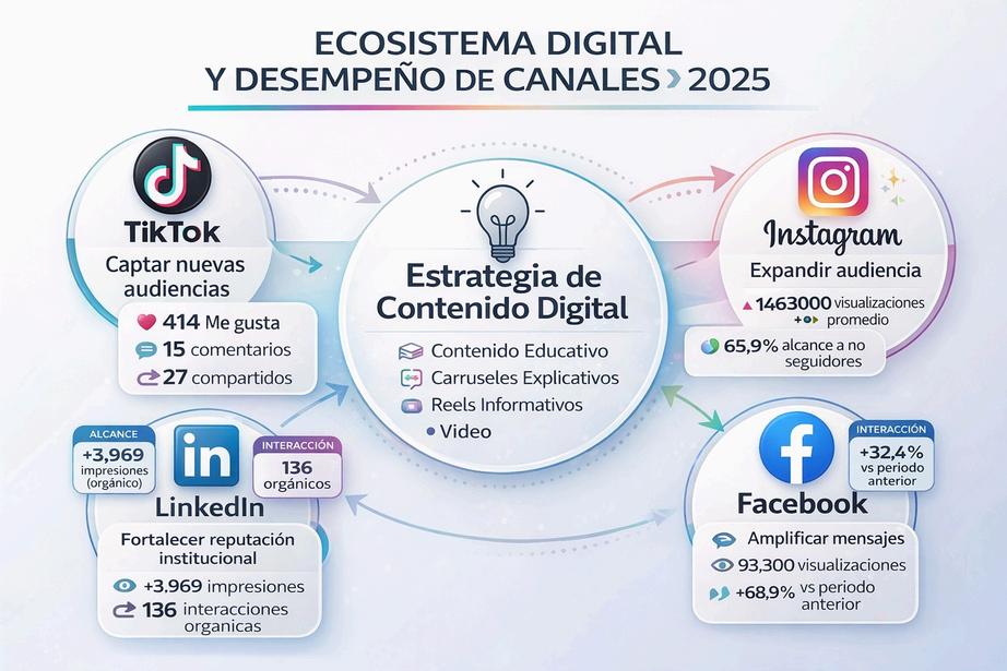 El desempeño digital 2025 muestra una combinación de visibilidad orgánica, crecimiento de comunidad y resultados de contenido en formatos educativos y audiovisuales. LinkedIn y TikTok evidencian crecimiento orgánico, mientras Instagram se consolida como canal prioritario de tráfico y rendimiento de piezas; Facebook cumple un rol de amplificación.