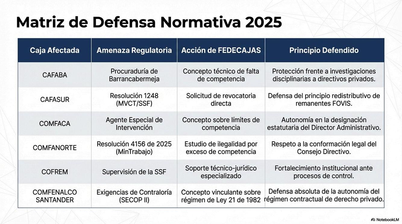 En cuanto a la defensa jurídica durante el 2025 FEDECAJAS elaboró conceptos jurídicos estratégicos para defender la correcta interpretación del régimen jurídico aplicable a las CajasdeCompensaciónFamiliar,loscualesconsistieronen: