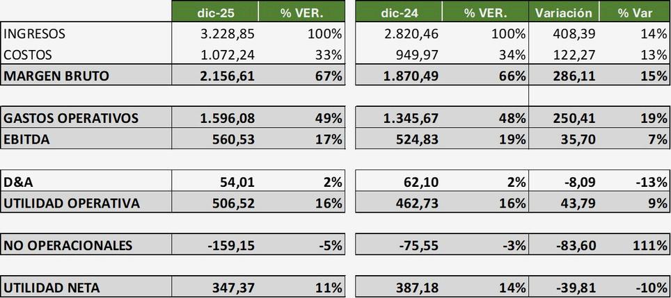 El EBITDA creció 7% hasta $560,53, aunque su margen bajó de 19% a 17% por el incremento de gastos operativos (+19%), que crecieron por encima de los ingresos — señal que merece atención en la gestión de costos administrativos y de estructura.
