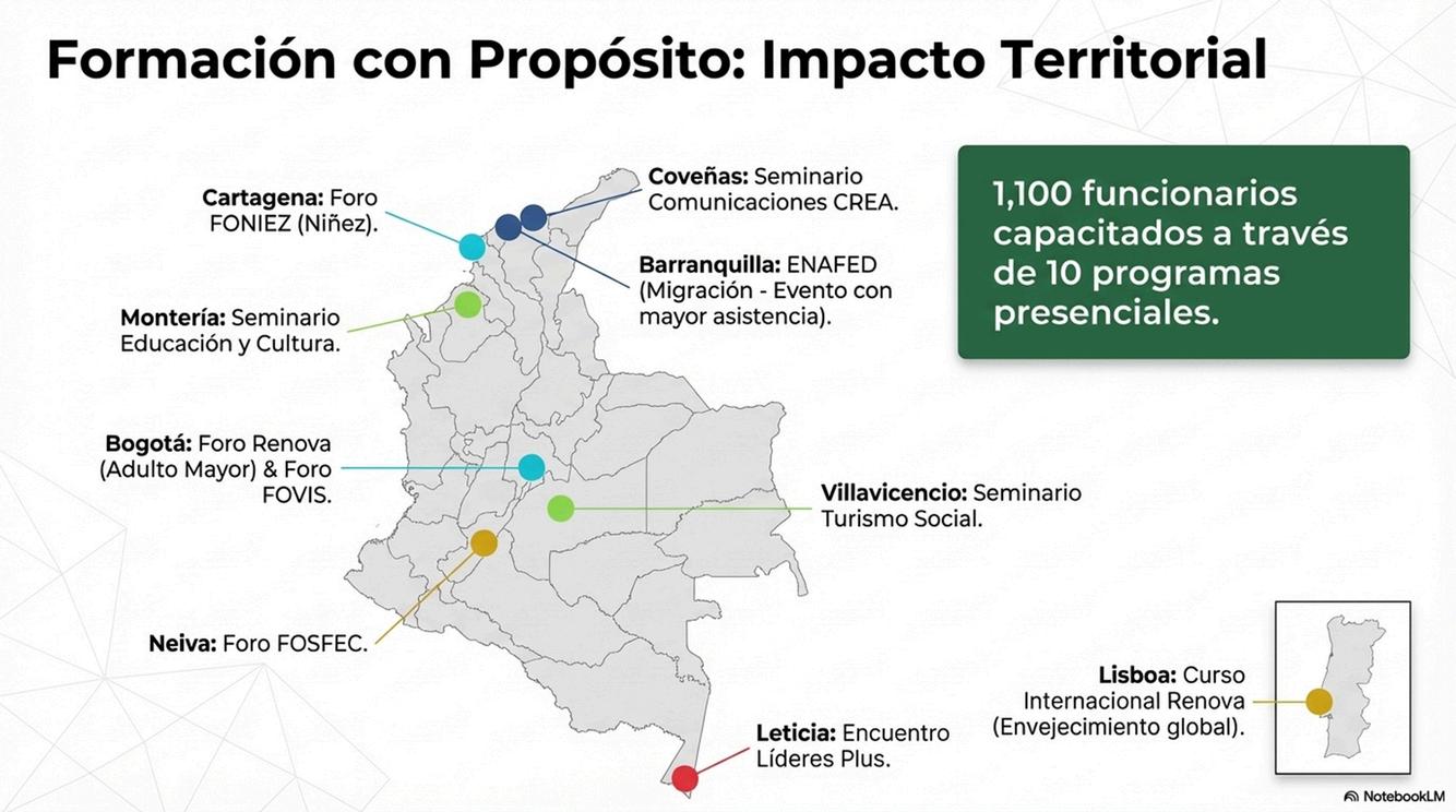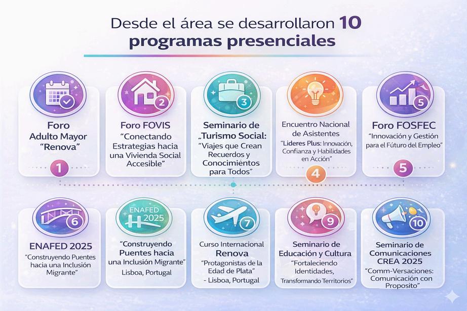 Loanterior,permitióampliarelalcanceterritorialygarantizaracceso a formación especializada en temáticas estratégicas como adulto mayor, migración, vivienda social, turismo, gestión financiera, comunicaciones, reforma laboral, primera infancia y habilidades digitalesfortaleciendoelSistemadeSubsidioFamiliar.