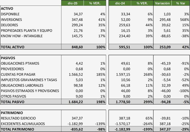Patrimonio: Sigue siendo negativo (-$835,62), aunque mejoró frente al año anterior (-$1.182,99). La empresa genera utilidades ($347 en 2025), pero las pérdidas acumuladas históricas aún no han sido absorbidas.