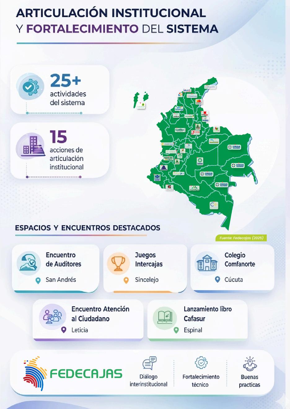 De manera complementaria, FEDECAJAS acompañó a las Cajas de Compensación Familiar en diversos encuentros y eventos institucionales que promovieron el intercambio de experiencias, la consolidación de buenas prácticas y el fortalecimiento del trabajo colaborativo dentro del sector. Entre estos se destacan el Encuentro de Auditores realizado en la Isla de San Andrés, la participación en los Juegos Intercajas en Sincelejo (Sucre), la inauguración de las aulas del Colegio COMFANORTE en Cúcuta (Norte de Santander), el Encuentro Nacional de Atención e Interacción al Ciudadano en Leticia (Amazonas) y el lanzamiento del libro de CAFASUR en Espinal (Tolima).