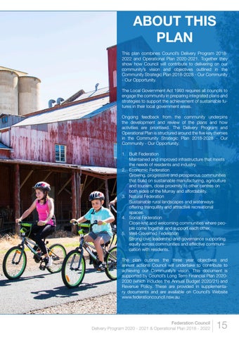 ABOUT THIS PLAN This plan combines Council’s Delivery Program 20182022 and Operational Plan 2020-2021. Together they show how Council will contribute to delivering on our community’s vision and objectives outlined in the Community Strategic Plan 2018-2028 - Our Community - Our Opportunity. The Local Government Act 1993 requires all councils to engage the community in preparing integrated plans and strategies to support the achievement of sustainable futures in their local government areas. Ongoing feedback from the community underpins the development and review of the plans and how activities are prioritised. The Delivery Program and Operational Plan is structured around the five key themes in the Community Strategic Plan 2018-2028 - Our Community - Our Opportunity. 1. Built Federation Maintained and improved infrastructure that meets the needs of residents and industry. 2. Economic Federation Growing, progressive and prosperous communities that build on sustainable manufacturing, agriculture and tourism, close proximity to other centres on both sides of the Murray and affordability. 3. Natural Federation Sustainable rural landscapes and waterways offering tranquillity and attractive recreational spaces. 4. Social Federation Close-knit and welcoming communities where people come together and support each other. 5. Well-Governed Federation Strong civic leadership and governance supporting equity across communities and effective communication with residents. The plan outlines the three year objectives and annual actions Council will undertake to contribute to achieving our Community’s vision. This document is supported by Council’s Long Term Financial Plan 20202030 (which includes the Annual Budget 2020/21) and Revenue Policy. These are provided in supplementary documents and are available on Council’s Website www.federationcouncil.nsw.au