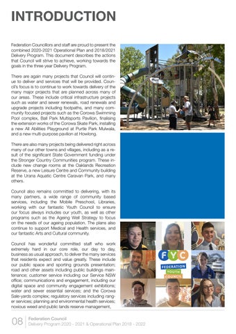 INTRODUCTION Federation Councillors and staff are proud to present the combined 2020-2021 Operational Plan and 2018/2021 Delivery Program. This document describes the actions that Council will strive to achieve, working towards the goals in the three year Delivery Program. There are again many projects that Council will continue to deliver and services that will be provided. Council’s focus is to continue to work towards delivery of the many major projects that are planned across many of our areas. These include critical infrastructure projects such as water and sewer renewals, road renewals and upgrade projects including footpaths, and many community focused projects such as the Corowa Swimming Pool complex, Ball Park Multisports Pavilion, finalising the extension works of the Corowa Skate Park, installing a new All Abilities Playground at Purtle Park Mulwala, and a new multi-purpose pavilion at Howlong. There are also many projects being delivered right across many of our other towns and villages, including as a result of the significant State Government funding under the Stronger Country Communities program. These include new change rooms at the Oaklands Recreation Reserve, a new Leisure Centre and Community building at the Urana Aquatic Centre Caravan Park, and many others. Council also remains committed to delivering, with its many partners, a wide range of community based services, including the Mobile Preschool, Libraries, working with our fantastic Youth Council to ensure our focus always includes our youth, as well as other programs such as the Ageing Well Strategy to focus on the needs of our ageing population. The plans also continue to support Medical and Health services, and our fantastic Arts and Cultural community. Council has wonderful committed staff who work extremely hard in our core role, our day to day, business as usual approach, to deliver the many services that residents expect and value greatly. These include our public space and sporting grounds presentation; road and other assets including public buildings maintenance; customer service including our Service NSW office; communications and engagement, including our digital space and community engagement exhibitions; water and sewer essential services; and the Corowa Sale-yards complex; regulatory services including ranger services; planning and environmental health services; noxious weed and public lands reserve management,