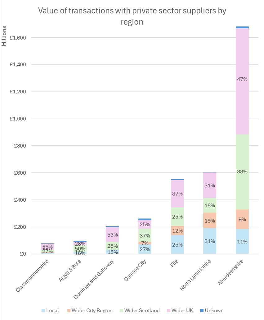 • Collectively Aberdeenshire Council spent 89% in their local authority and city region area, Dumfries and Galloway Council 88%, Clackmannanshire Council 45%, North Lanarkshire Council 42%. Argyll and Bute 36%, Fife Council 22% and Dundee City Council 7%.