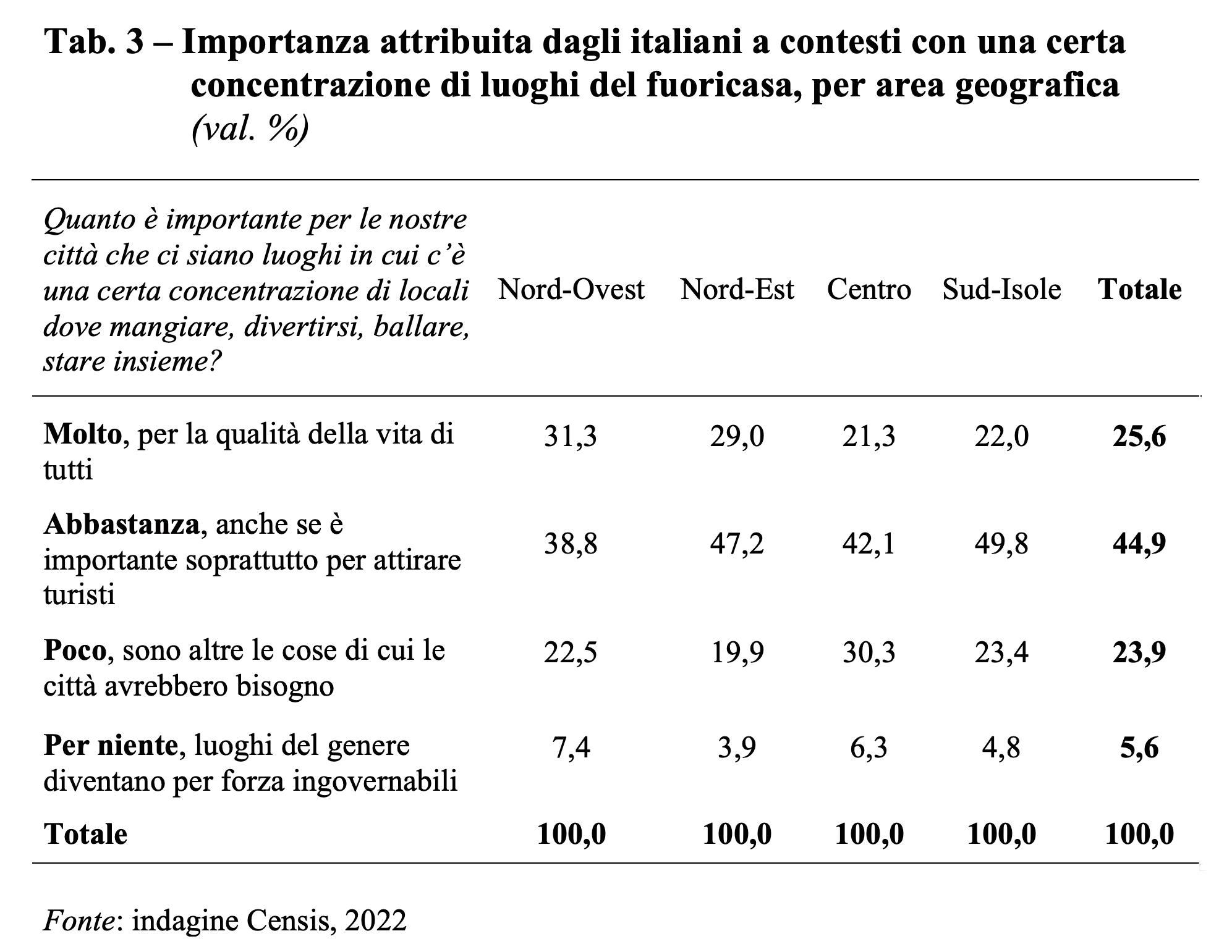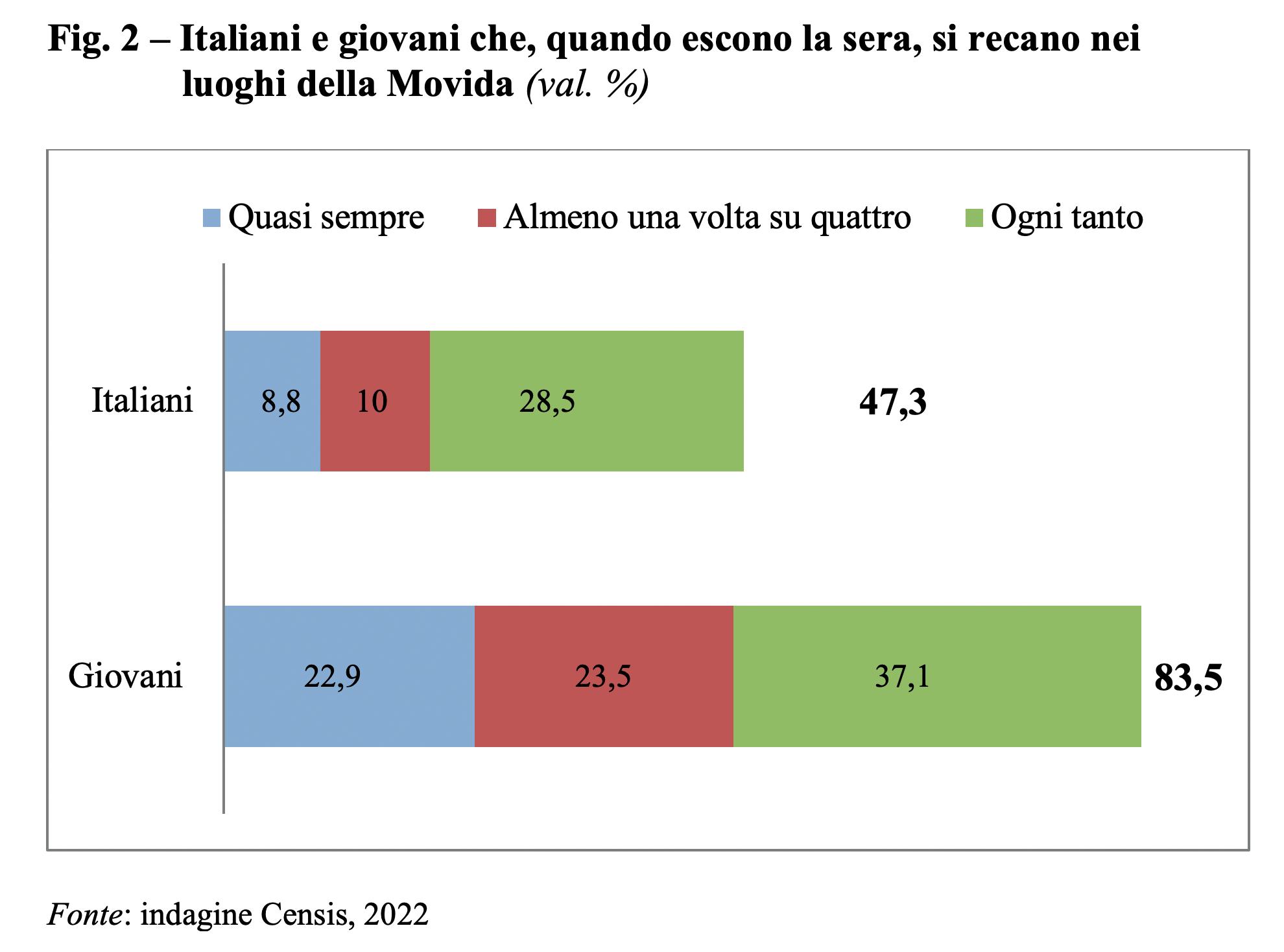 È un valore sociale diretto, evidente, che coinvolge e richiama la funzione dei luoghi della Movida, percepiti come la condensazione delle opportunità di relazioni, il loro essere vibranti, pieni di persone e di locali in cui avere accesso a cibi e bevande che magari non si hanno nella routine quotidiana; un aspetto che li rende essenziali per contribuire a soddisfare quella voglia di micro-benessere di cui gli italiani, che hanno alle spalle un triennio traumatico e davanti ad essi aspettative non certo esaltanti, dichiarano di avere assoluto bisogno.