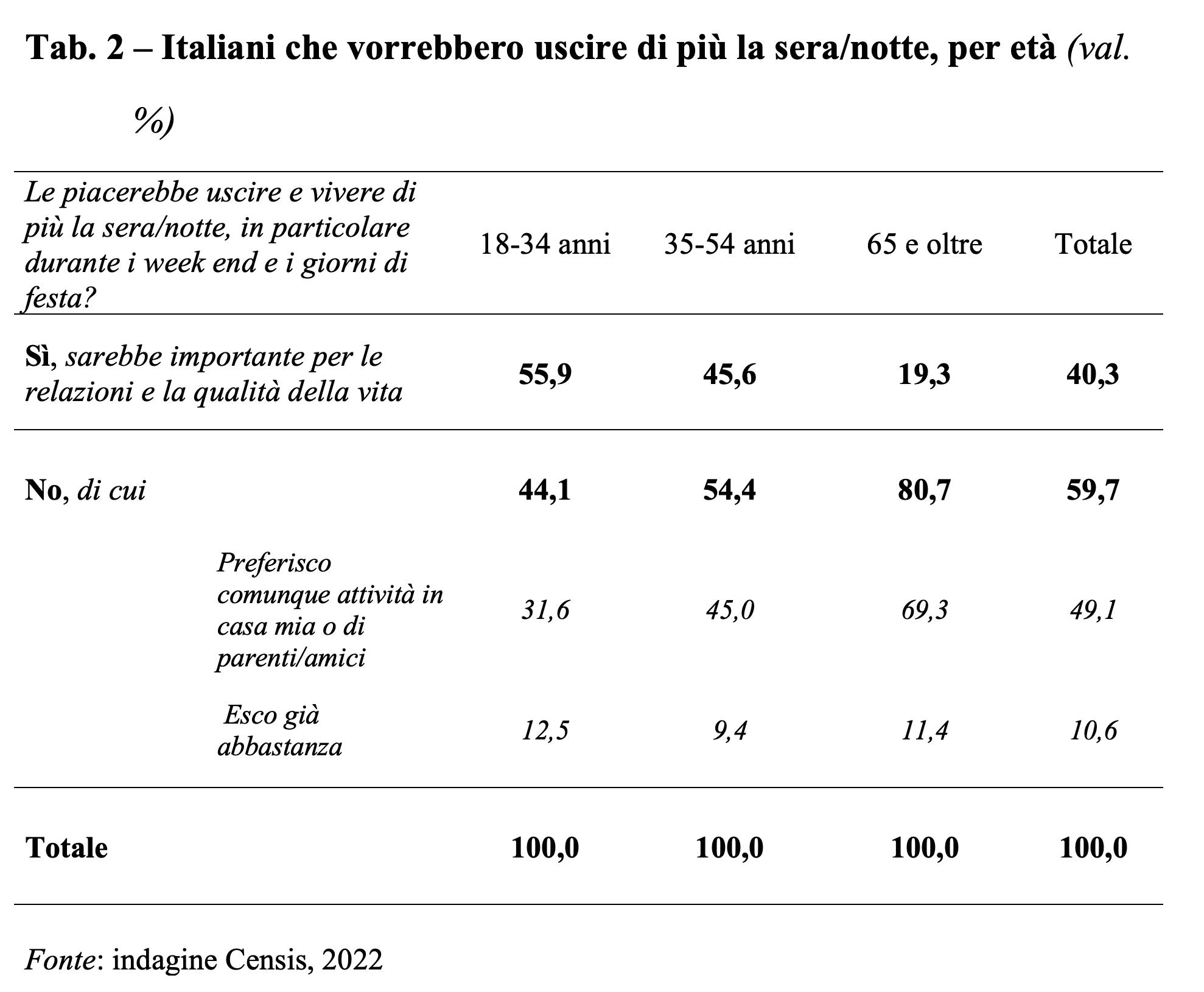 L’apprezzamento degli italiani nei confronti della relazionalità che si svolge nel fuori casa e il suo positivo impatto sulla qualità della vita emerge anche dalla voglia di uscire con maggior frequenza la sera, beneficiando con più intensità delle opportunità relazionali legate ai tanti e diversi luoghi del fuori casa.