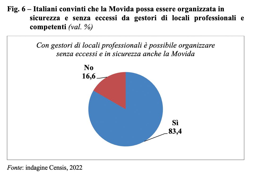 Ed è importante sottolineare come, malgrado anni di intossicazione informativa intorno alla confusione tra Movida e fenomeni di degrado e disagio sociale, gli italiani continuano ad averne una visione positiva, a percepire la rete di strutture del fuori casa come una risorsa e la loro assenza come una minaccia.