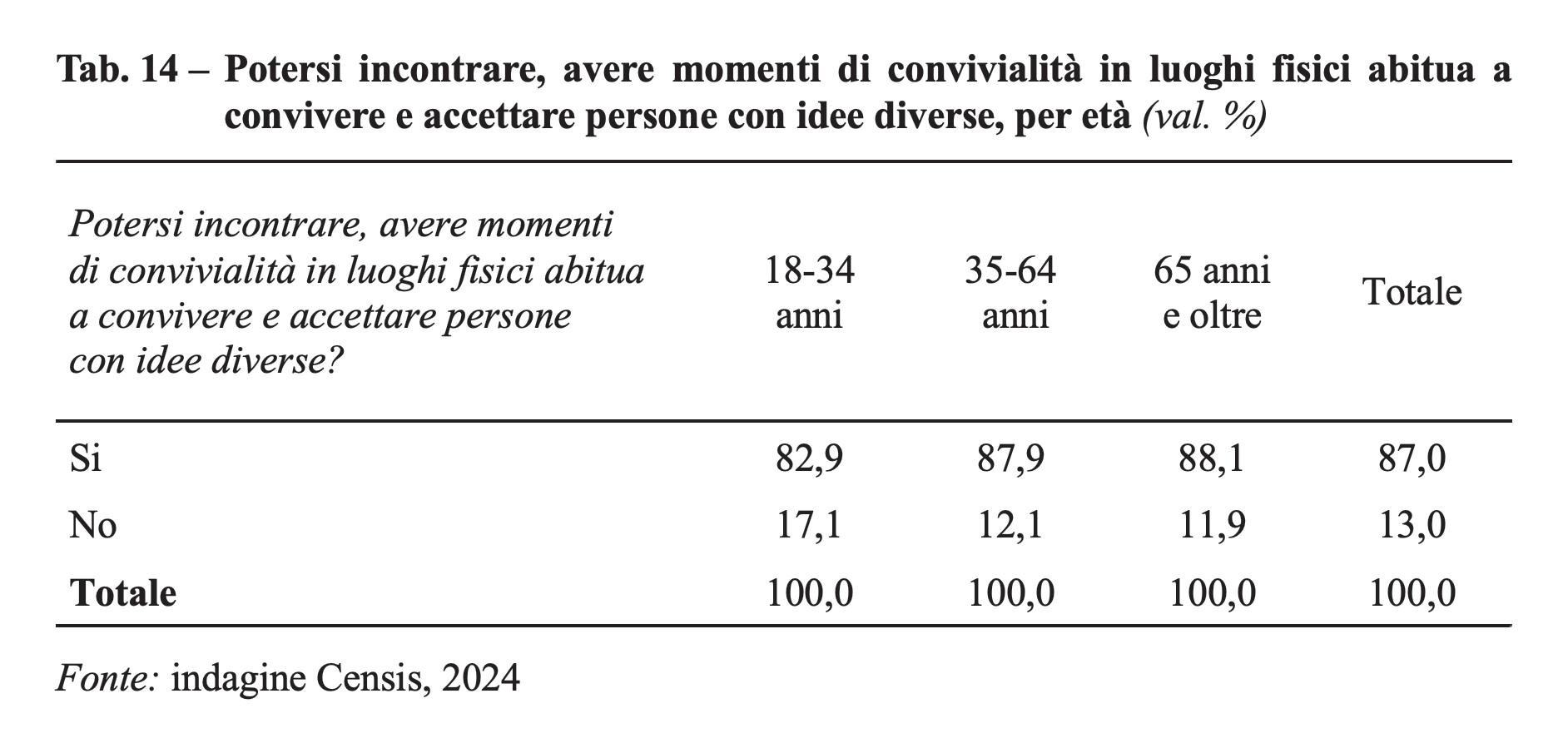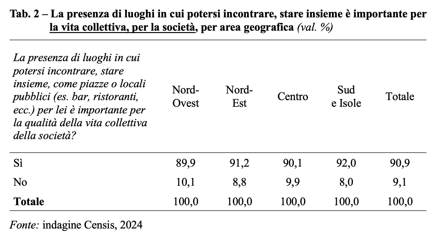 I risultati della ricerca certificano che la presenza di luoghi in cui potersi incontrare, stare insieme, come piazze o locali pubblici quali bar, ristoranti, enoteche ecc. è per gli italiani importante, non solo per il proprio benessere soggettivo, ma anche per la qualità della vita collettiva.