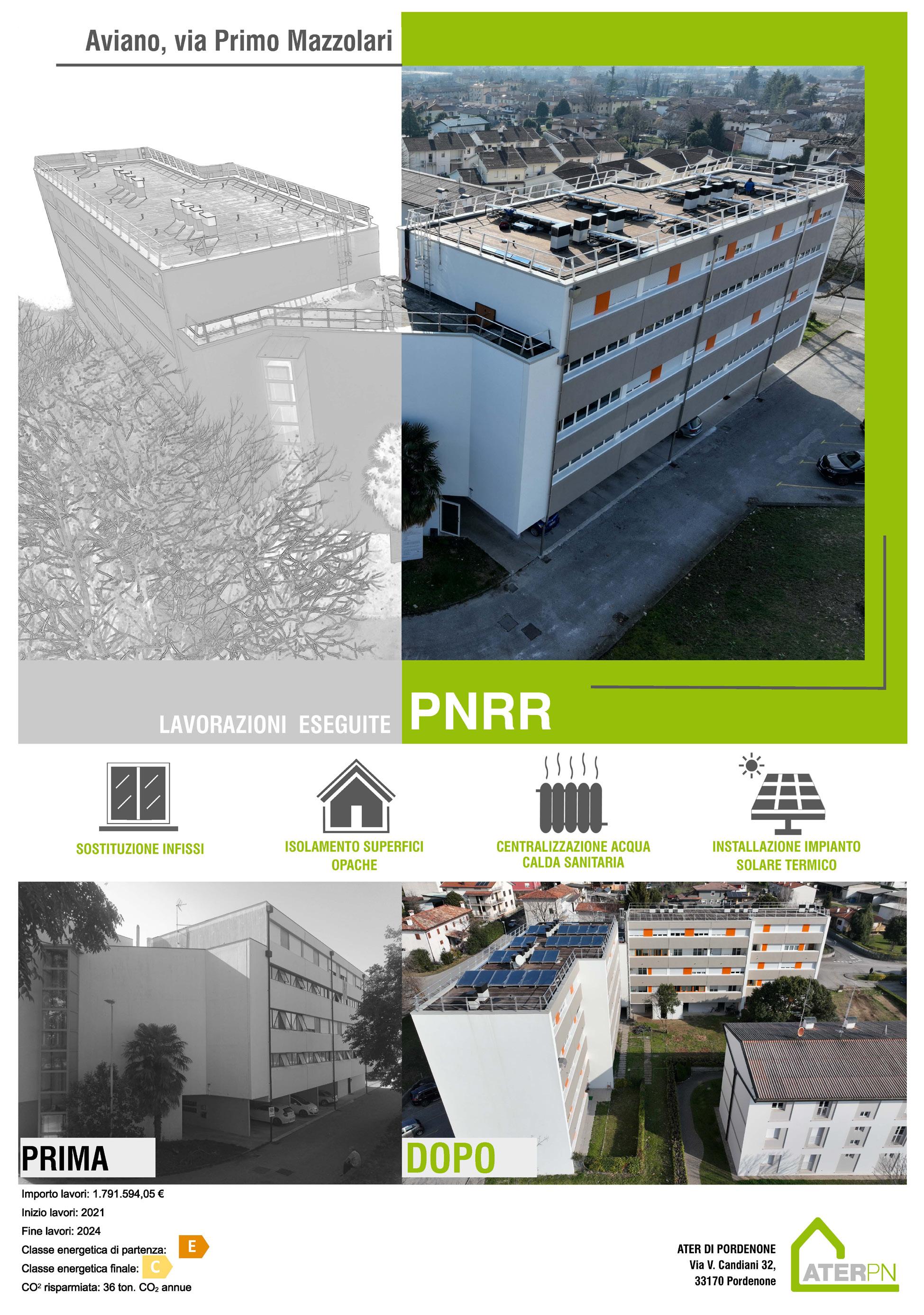 • Intervento PNC al PNRR ad Aviano, via Mazzolari 2: intervento di efficientamento energetico di un edificio di proprietà Ater da 24 alloggi per un importo di € 2.270.000.