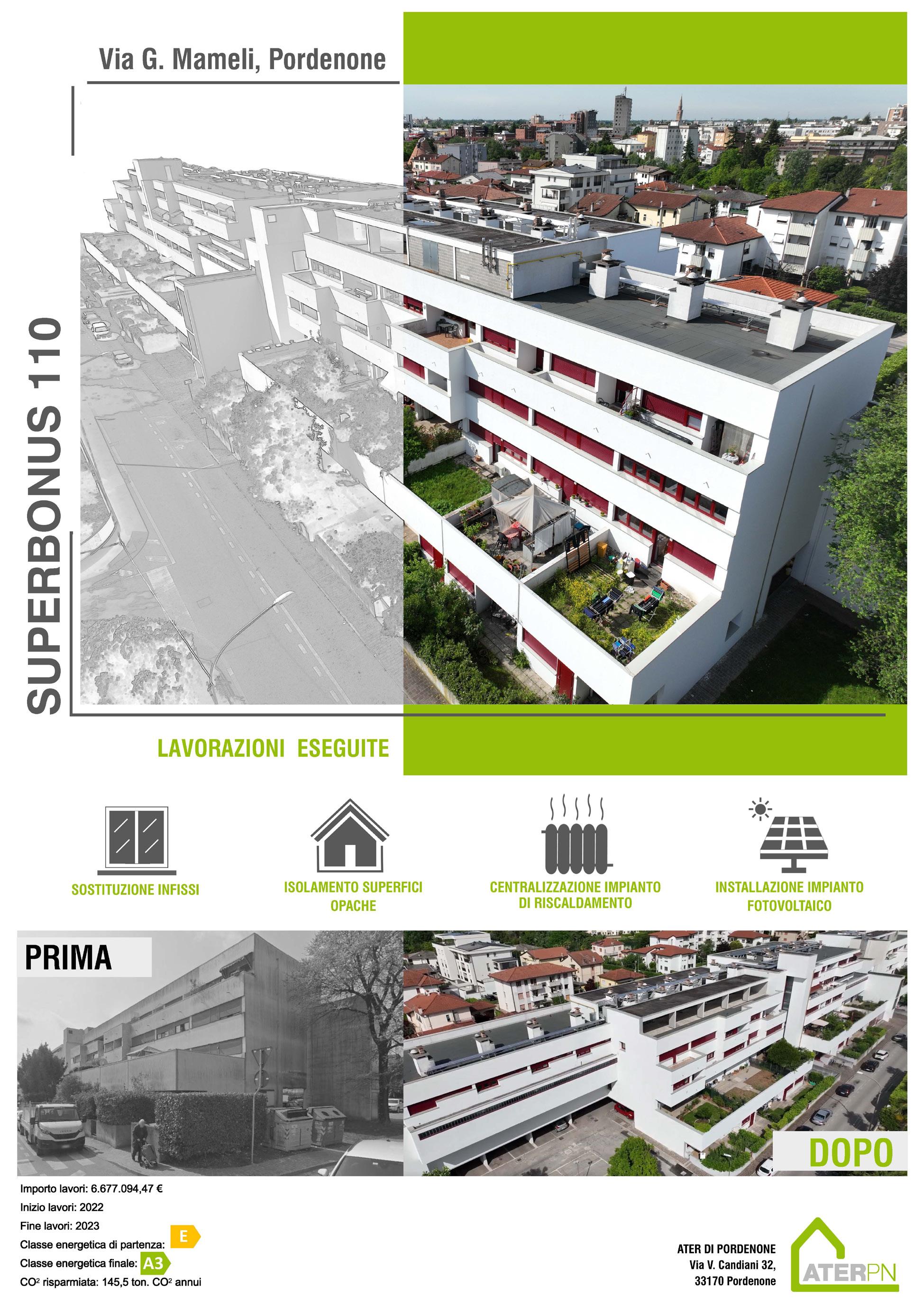 • Intervento PNC al PNRR a Cordenons, via Isonzo: intervento di efficientamento energetico di un edificio di proprietà Ater da 25 alloggi per un importo di € 2.428.000.