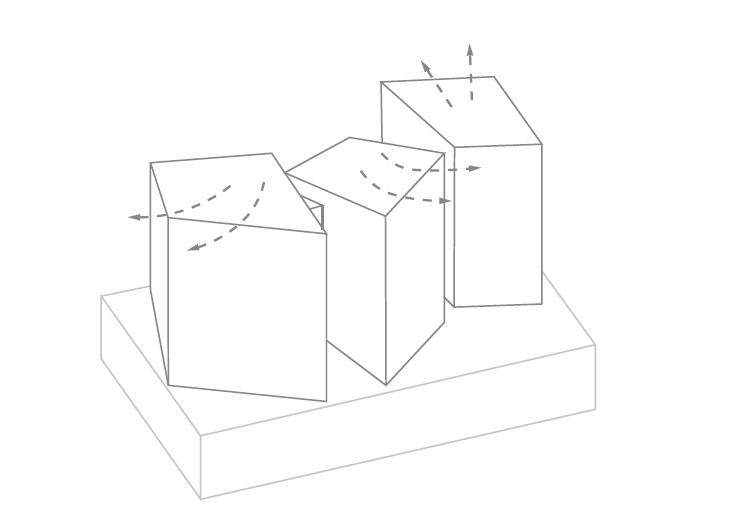 La forma dei tre blocchi irregolari che emergono alla piattaforma galleggiante è il risultato di questo processo di astrazione del territorio per portarlo ad essere architettura.