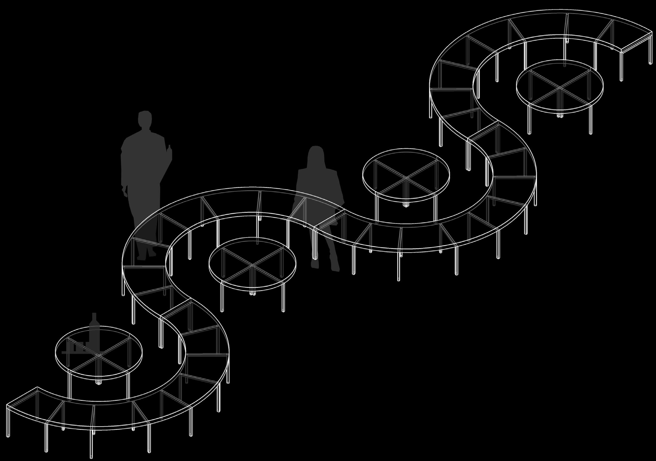 Il modulo è composto da semicerchi e cerchi in metacrilato di differenti altezze, pensati in modo daessere usati come sedute, tavoli da studio e tavoli da lavoro di giorno, e postazioni per il ballo di notte.