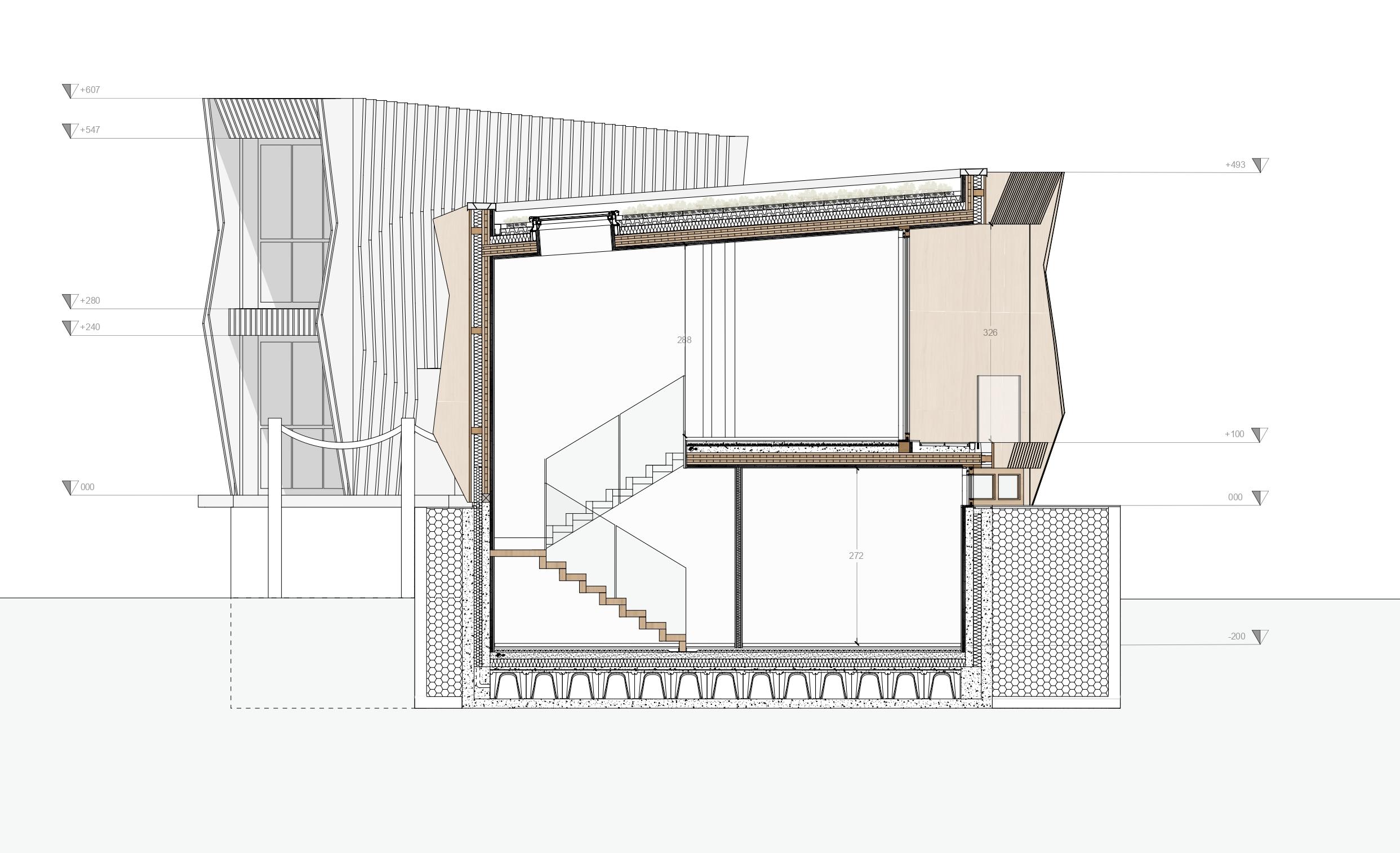 logia con la quale viene realizzato l’involucro esterno, caratterizato da una parete ventilata formata da una lamiera ondulata staccata di pochi cm, dalla facciata. La stessa geometria è ripresa sulla figura del piano terreno