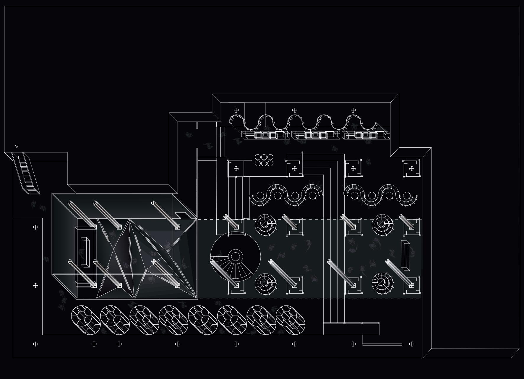 Il progetto gioca sulla macro-interferenza tra lo spazio esistente e quello progettato mantenendo comunque un forte legame con o spazio in cui esso si insedia. Si passa da uno spazio di studio ad una discoteca.